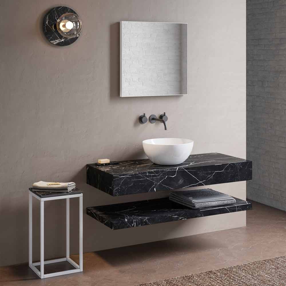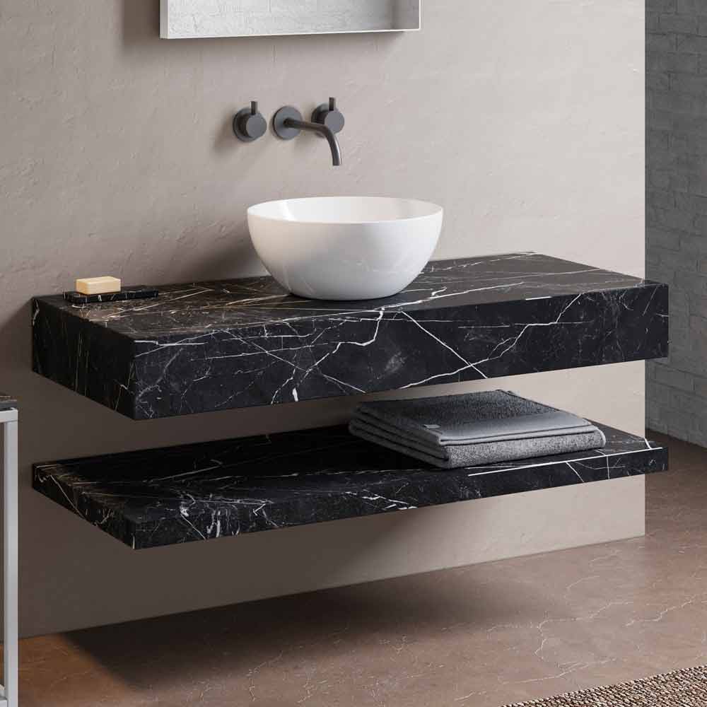The suspended console and shelf are made of porcelain stoneware available in 4 finishes.