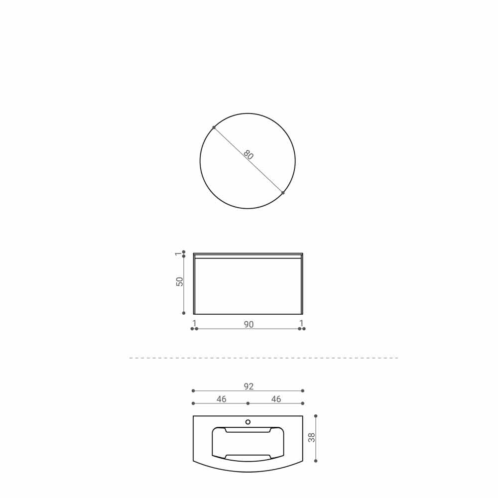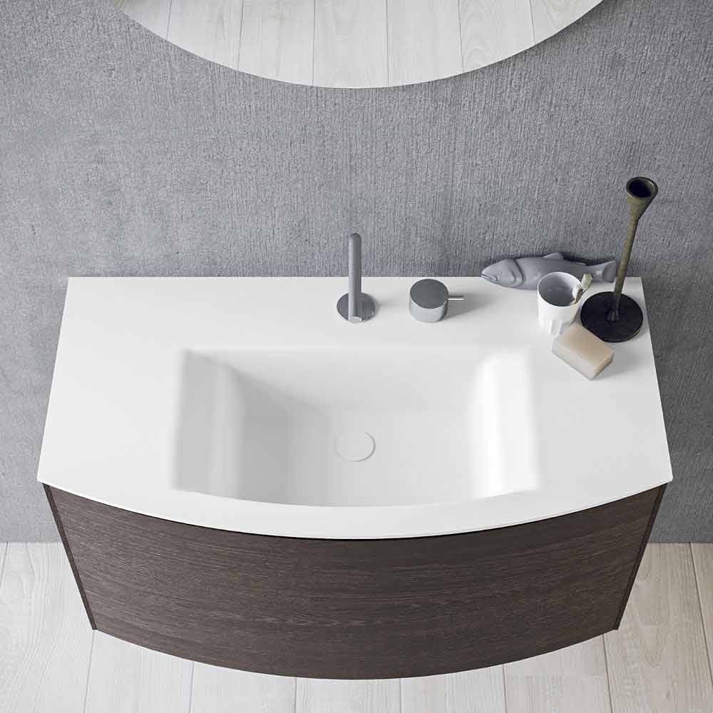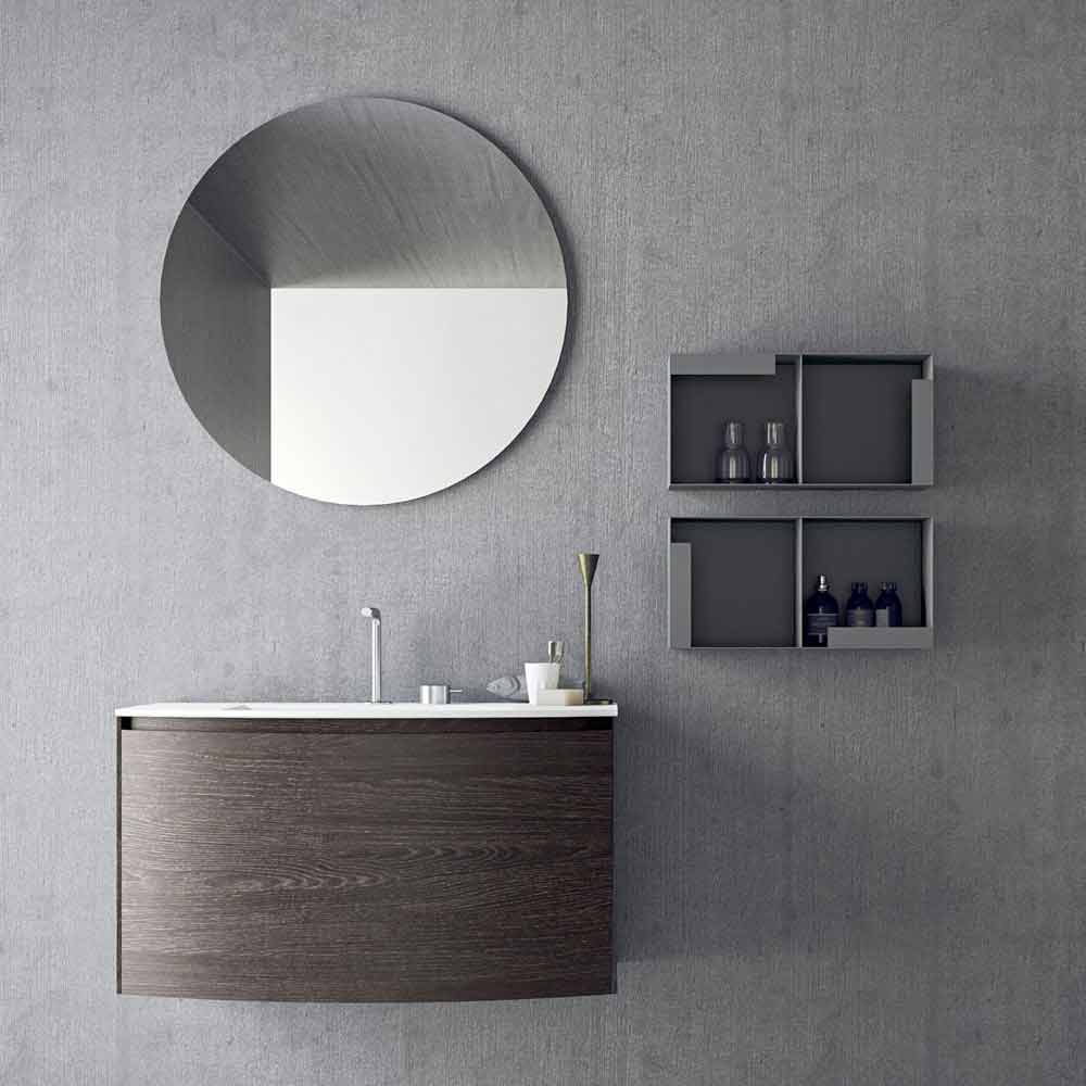 This formal clarity is given by the groove door with an inclined profile and by the round mirror that breaks the regularity of the composition, recalling the curvilinear wall unit below. The peculiarity of this composition is given by the built-in washbasin characterized by two lateral sides that gently descend towards the basin.