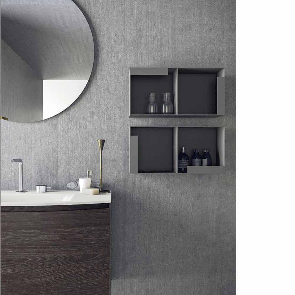 A modern and minimal composition, whose protagonists are the 4 open shelves of the two metal shelves whose design creates four different protrusions , creating a play of shapes that interrupts the continuous continuity; of the whole composition, and which takes up the frame of the main cabinet.