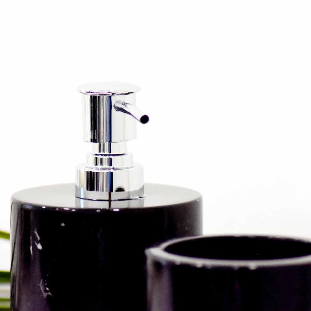 3 bathroom accessories : a toothbrush holder, a liquid soap dispenser and a soap dish.