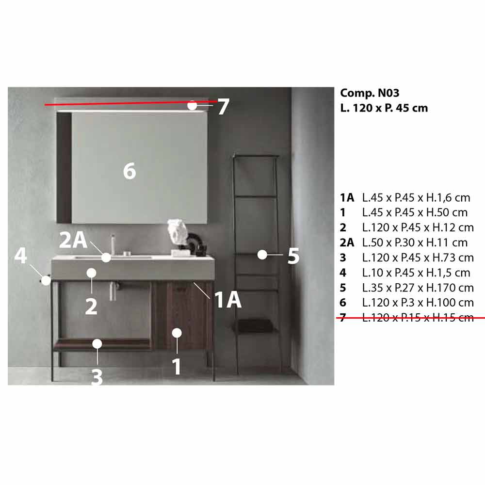 The composition includes: 1A L.45 x P.45 x H.1,6 cm 1 L.45 x P.45 x H.50 cm 2 L.120 x D.45 x H.12 cm 2A L.50 x P.30 x H.11 cm 3 L.120 x P.45 x H.73 cm 4 L.10 x D.45 x H.1.5 cm 5 L.35 x P.27 x H.170 cm 6 L.120 x P.3 x H.100 cm