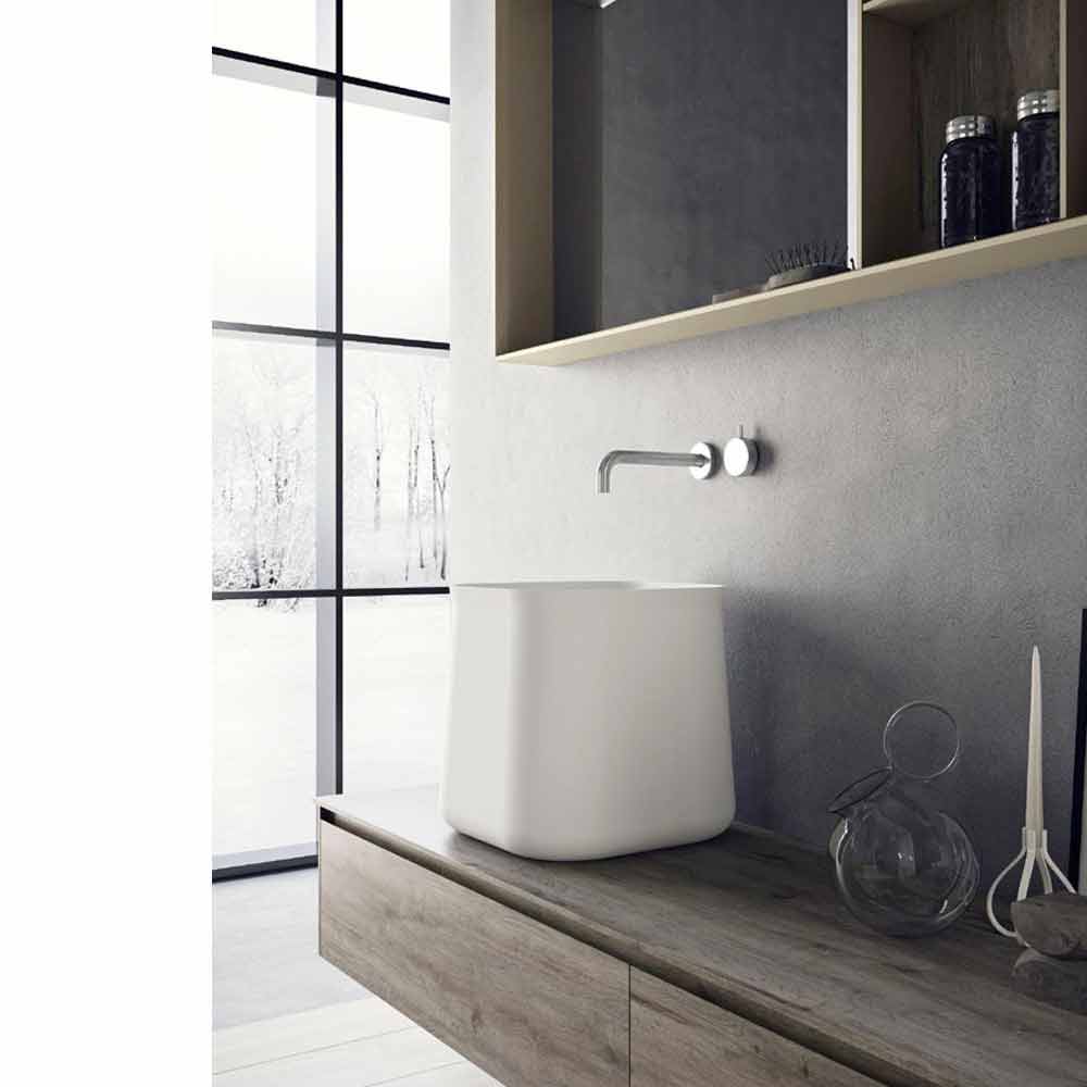The peculiarity of this composition is given by the silhouette of the tall countertop washbasin , which is distinguished by the edge that opens outwards recalling the shape of a tulip, as opposed to the linearity of the underlying compartments, mitigating the shapes.