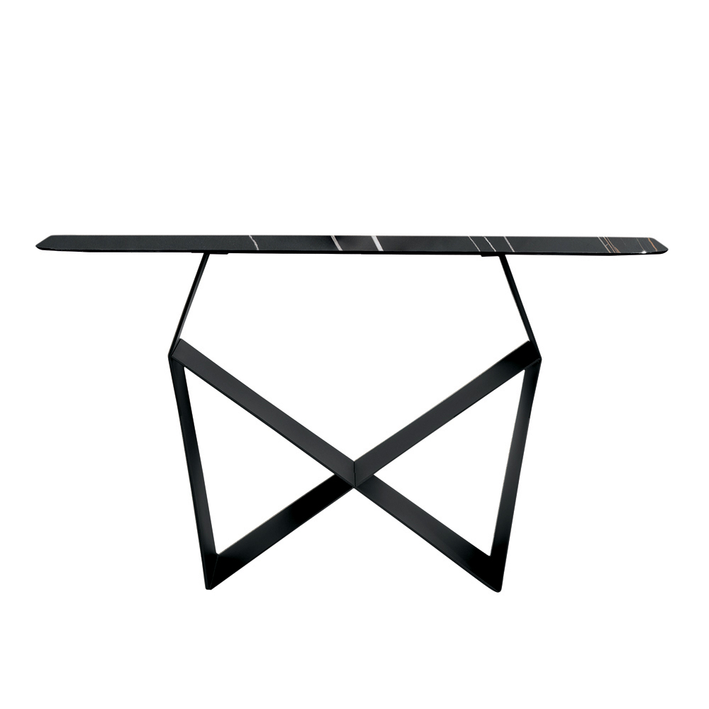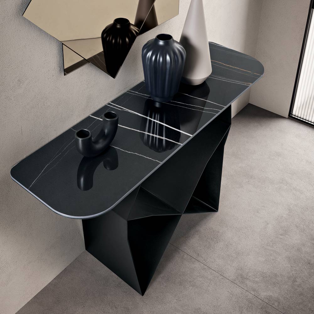 The structure stands out for its painted metal base that creates an original bow-tie shape , creating a refined interplay of solids and voids. This detail lends dynamism and momentum to the composition, giving the console a dramatic yet balanced presence.