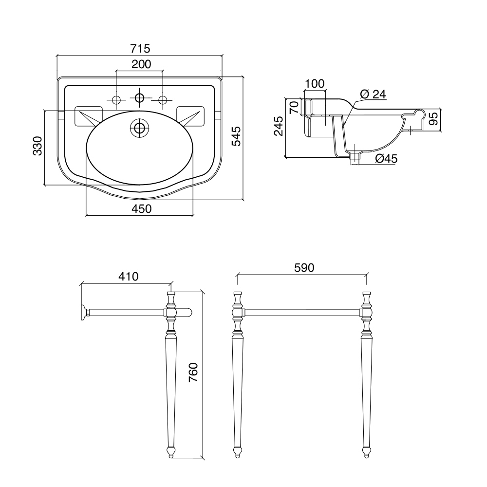 - top: L 71.5 x D 54.5 x H 24.5 cm base: L 59 x D 41 x H 76 cm, with single washbasin with splashback and splash guard 1 or 3 tap holes - L 715 mm;