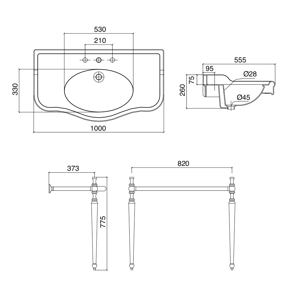 - top L 100 x D55,5 x H 26 cm, base L 82 x D 37 x H 77,5 cm, with single washbasin with splashback and splash guard 1 or 3 tap holes - L 1000 mm;