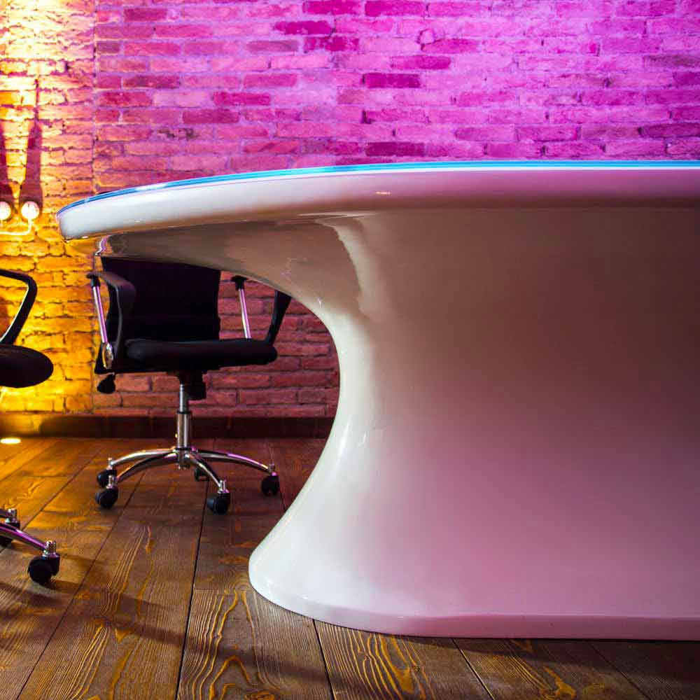 Customisable in colour and size. In addition to the aesthetic aspect, Info Table is also technologically advanced, thanks to the chromotherapy of the RGB lights under the crystal, and thanks to the electrified bar placed in the centre of the table, allowing any type of connection from any location.