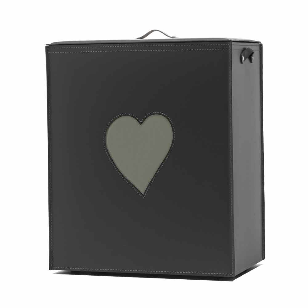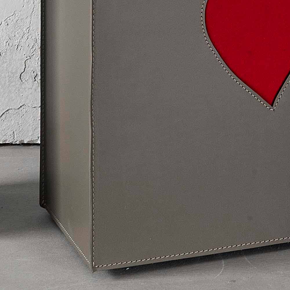 Design laundry basket in 100% made in Italy Adele leather Rectangular laundry basket realized in regenerated leather both inside and outside, with heart-shaped decoration chosen from red or taupe color. The bottom is made of plywood, also covered in leather. Equipped with practical rubber feet. Inside there is a removable cotton bag. Quality materials, resistant and meticulous attention to detail characterize the Adele laundry basket, made entirely in Italy. A complement not only functional, but also decorative. Adele is available in different colors, choose the one you prefer.