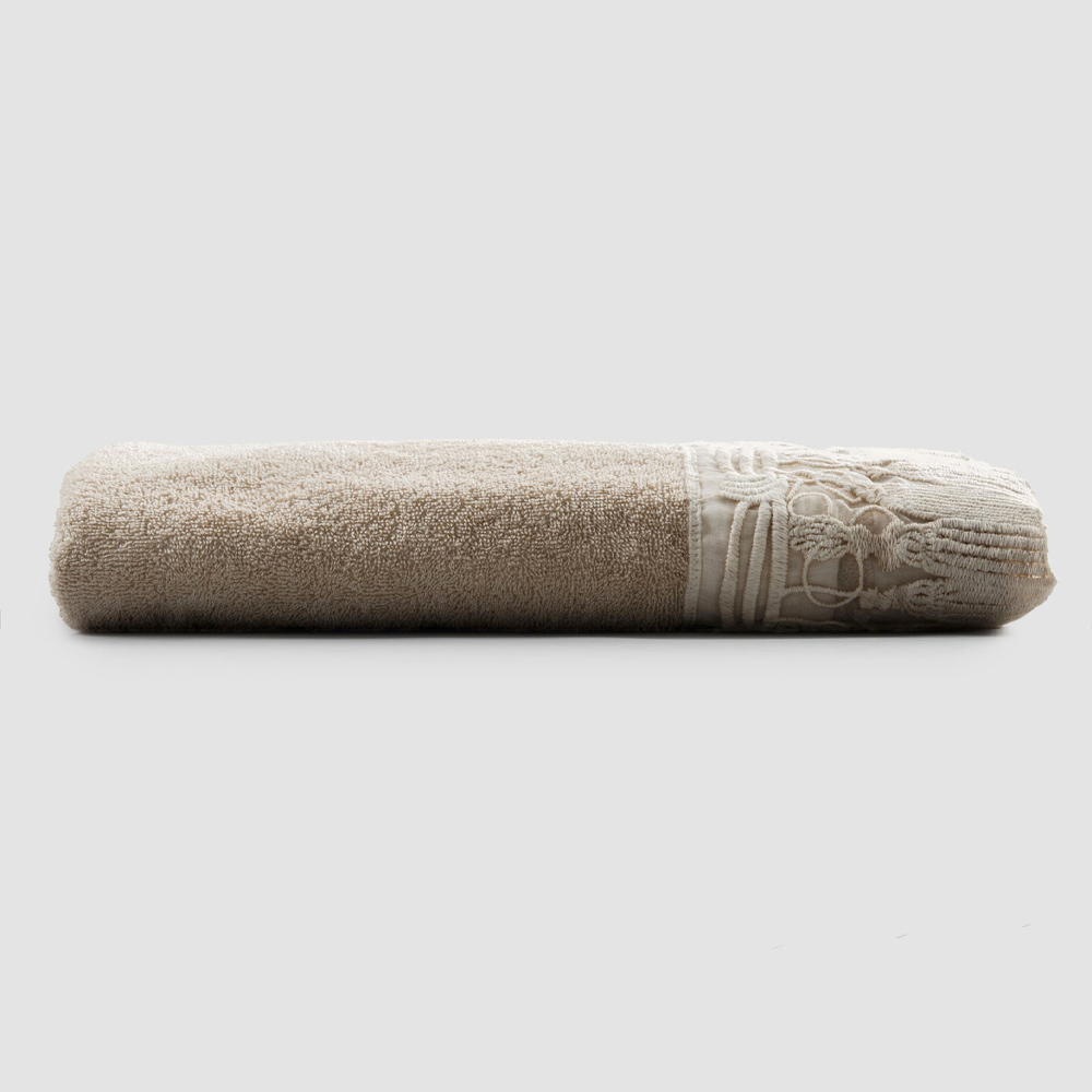 The value of tradition meets the modern lifestyle with the 'bath towel cotton terry pinkish beige color, with edge Tassel lace for an elegant and luxurious style.