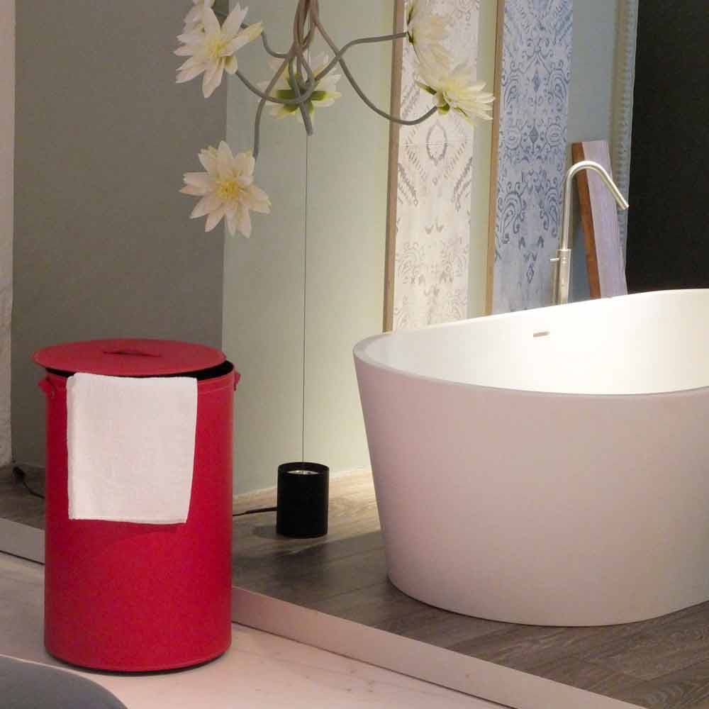 Cylindrical laundry basket in regenerated handmade leather Roby Roby is a unique cylindrical laundry basket, handmade by Italian Master Craftsmen. Roby is made entirely of regenerated leather, complete with a removable inner bag in pure cotton, enriched with rubber feet and a coated multi-layer wood base. Equipped with small and meticulous details Roby presents a simple and elegant design. Roby is available in different colors, choose the finish you want most!