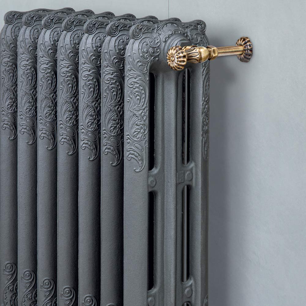 Hydraulic radiator in cast iron with cast iron grey finish consisting of 3 columns with traditional artistic designfrom the late 19th/early 20th century, entirely made in Italy , with vent valve and blind cap included . This piece satisfies the desires and needs of an increasingly discerning and demanding user thanks to the choice of high-quality, durable materials and finishes that make it the perfect complement to any room. Design and functionality come together to create this product, guaranteeing the quality of Made in Italy craftsmanship.