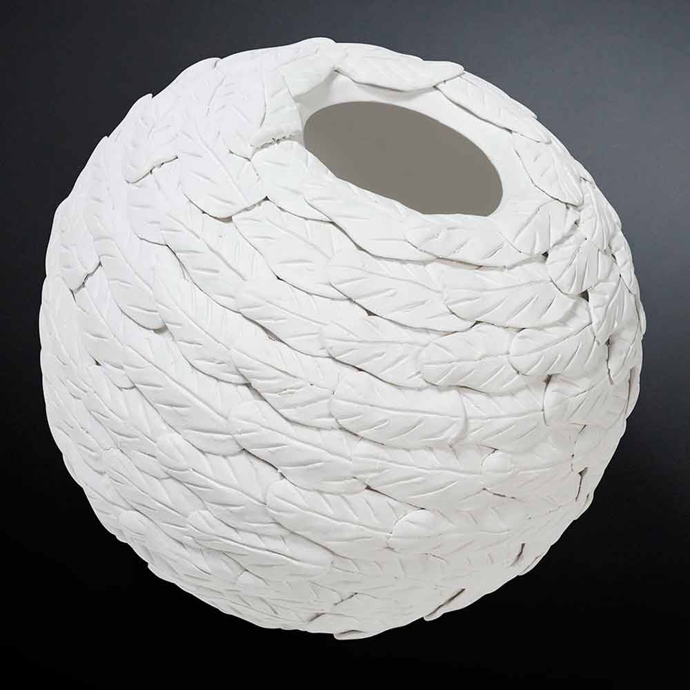Decorative vase for interiors with spherical shape in matt white ceramic, handmade in Italy. An idea that comes from a classic and particularly elegant design enriched by the wonderful processing with leaf texture that covers the entire structure of the vase, increasing its value and uniqueness for an exclusive and refined result . The use of ceramics and craftsmanship underline its value and quality making it capable of adapting to any stylistic situation. An ideal aesthetic for the most varied environments, from home furnishings to that of hotels, restaurants, contract areas, spas but also as a setting for events and weddings.