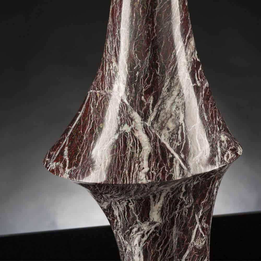 Elegant vase for interiors in Antico d'Italia red marble, a prestigious dark purple material with veins in shades of green and white made through a 100% Made in Italy production . Its production takes place through the processing of natural stones with 5-axis pantographs that allow to obtain more complex shapes than simple rotation volumes. This elegant piece of furniture comes from the union between the study of natural phenomena and the interaction of the materials used with human technology to give life to a unique and avant-garde style of furniture. The result is an exclusive decorative element capable of enriching any environment with a modern and refined aesthetic with personality. An ideal style for the most varied environments, from home furnishings to that of hotels, restaurants, contract areas, spas but also as a setting for events and weddings.