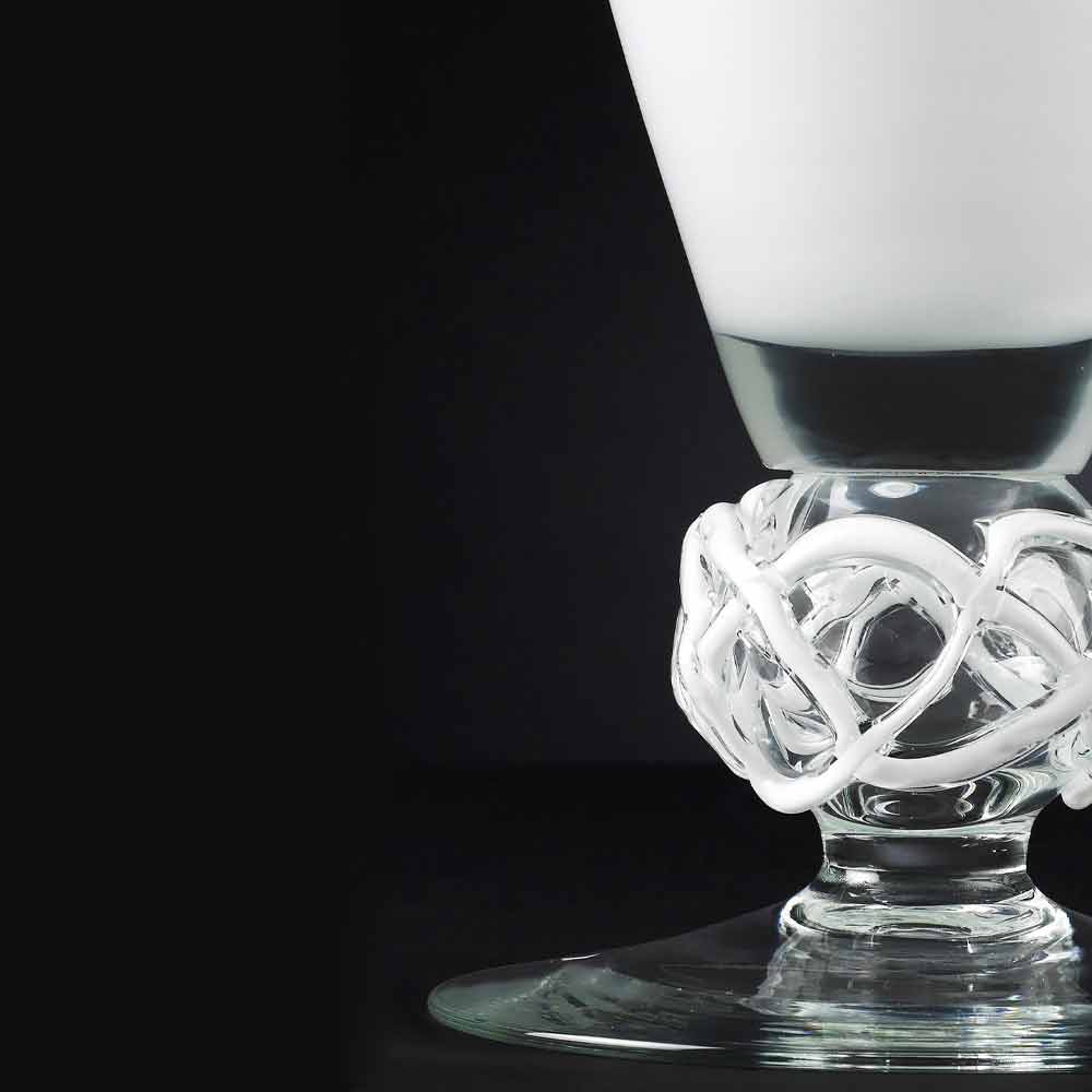 Decorative vase for interior decoration in white finish glass with transparent base enriched by an elegant decoration made through a 100% Made in Italy craftsmanship . A refined complement underlined by simple and minimal lines that allow it to become part of any space with classy furnishings. The particular decoration at the base of the vase enriches its aesthetics and increases its value, which increases its elegance for a result with a strong sophisticated personality . An ideal design for the most varied environments, from home furnishings to that of hotels, restaurants, contract areas, spas but also as a setting for events and weddings.