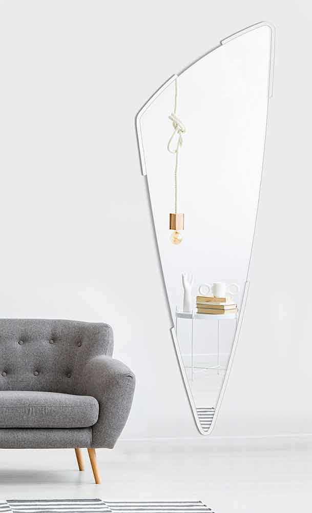 This stylized wall mirror with a cantilevered shape presents elegant lines and modern shapes combined with a refined lacquered finish for a result with a minimal and decorative aesthetic impact, in a unique style.
