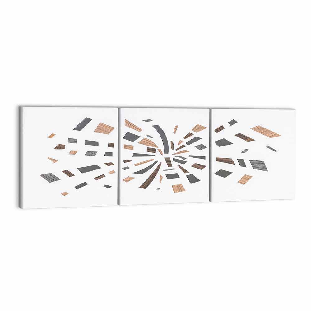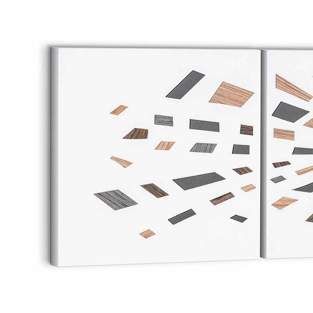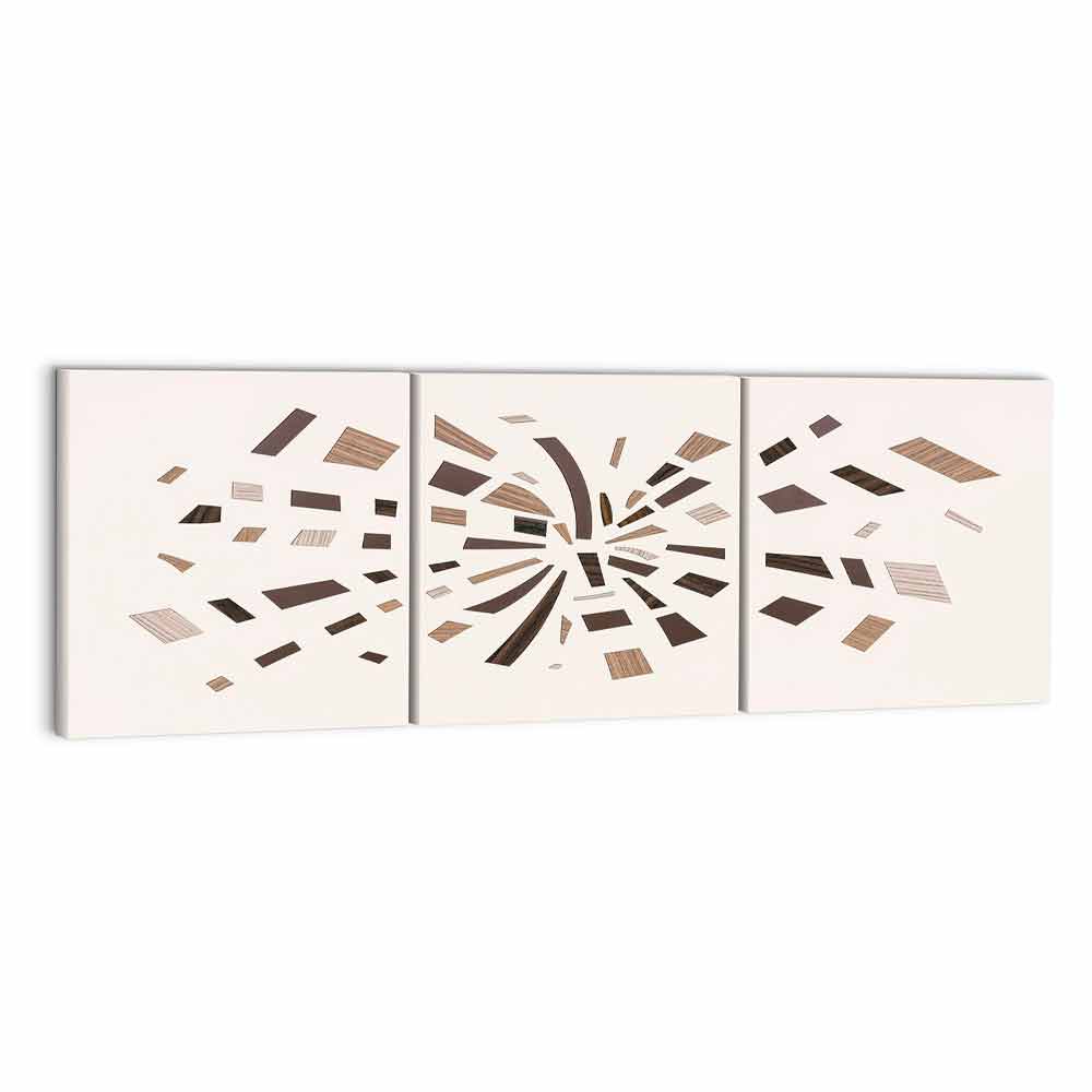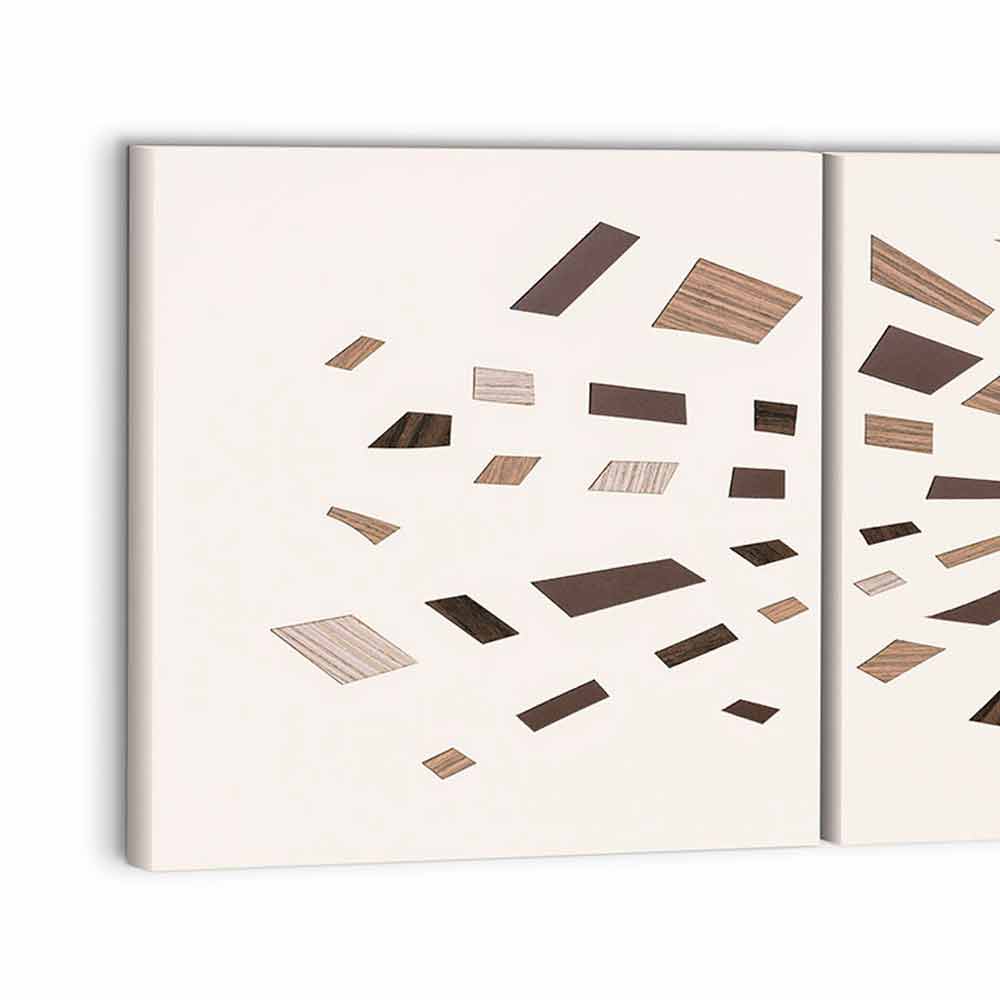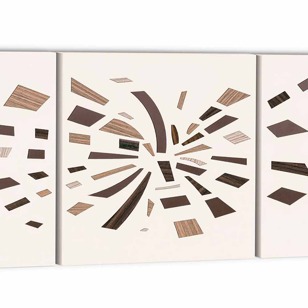 Elegant decorative wall panel made in Italy with support in mixed cotton canvas (330g) applied to a wooden frame and enriched with laminate and tone-on-tone wood applications characterized by different essences and shades of color. Three panels joined together to give life to a result with a wonderfully balanced design as well as the particular texture and colors that make it a real work of art, a perfect complement for settings with a strong modern personality . Its peculiarity is represented by the extraordinary elegance conferred by the wooden details which create a harmonious and exclusive composition capable of underlining the contemporary aesthetics of the entire panel.
