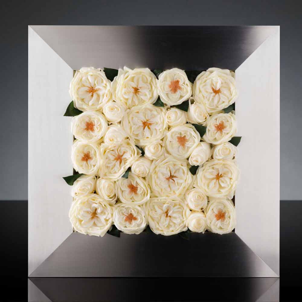 Modern wall picture made in Italy in chromed metal and artificial white roses . An idea of furniture that comes from the unusual encounter between the beauties of nature and a modern design, emphasizing the charm of both worlds in an exclusive way. What is born is a decorative complement with a sophisticated soul that knows how to furnish and fill any domestic or contract environment with a contemporary style through its extreme versatility and refined minimalism . Ideal for giving a sense of three-dimensionality to the walls of your home, this panel plays a fundamental role by capturing every attention thanks to its original and creative soul that brings the mind into a green landscape giving peace and tranquility .