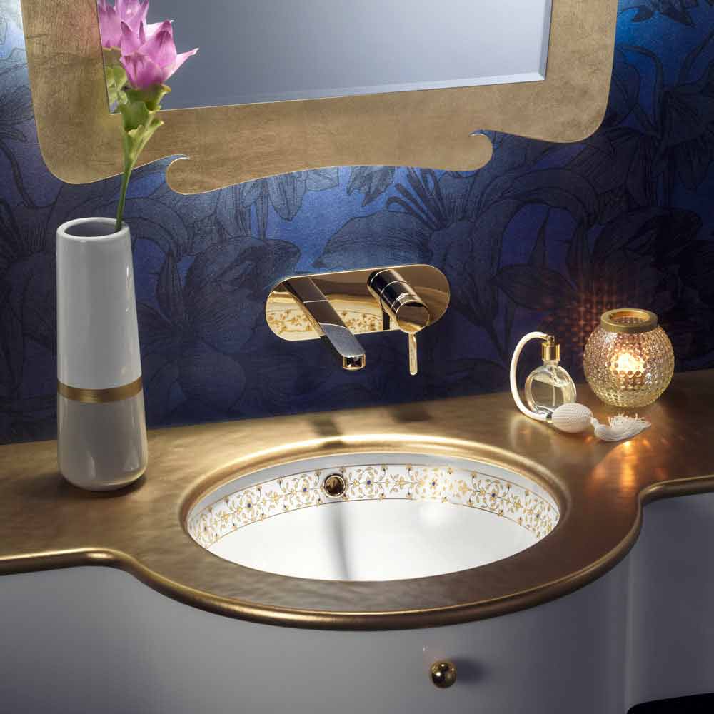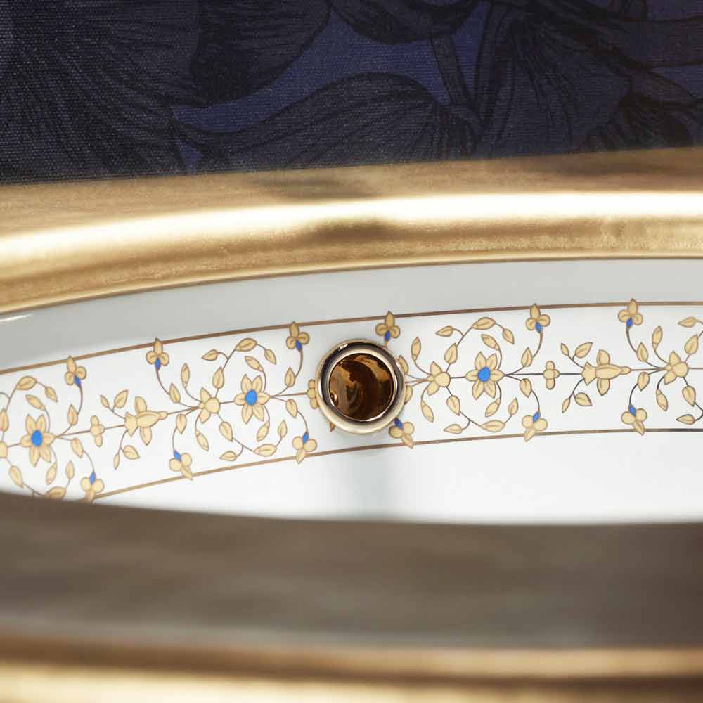 Bathroom built-in sink handmade in Italy in fire clay, with stripe with a blue floral decoration and 24k gold.