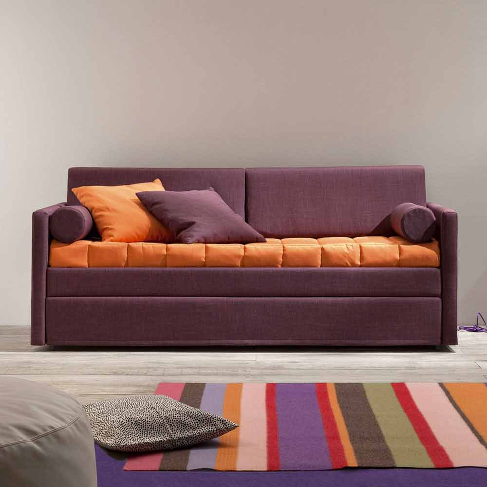 Bunk sofa bed covered in burgundy fabric made in Italy.