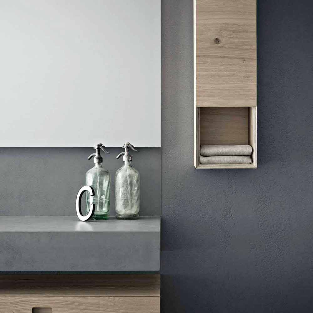 The peculiarity of this composition consists in the contrasts of material: the colors of the concrete that make up the doors and washbasin tops blend perfectly with the warm surfaces of the oak wood worked with exclusive treatments or the materiality of the new innovative materials such as laminam.