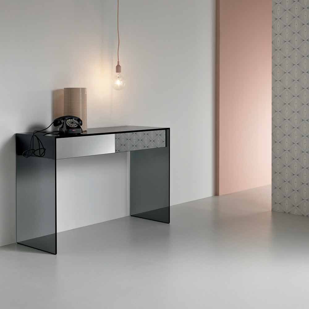 Modern consolle desk hand-made in Italy in smokey glass with wood drawer.