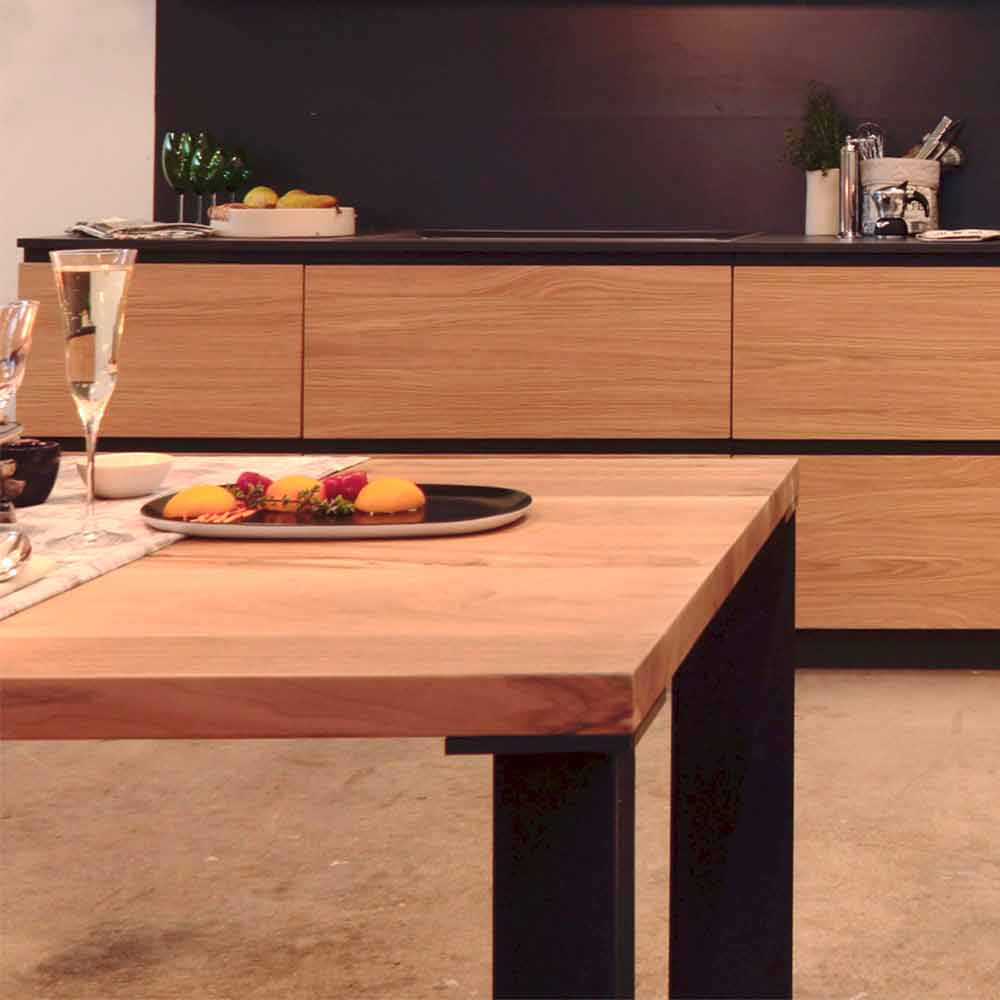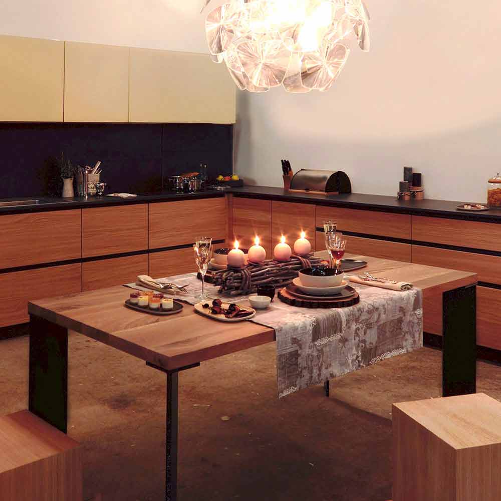 A table with essential lines that interprets the most basic geometry. The peculiar feature are the legs positioned diagonally, compared to the lines of the top. Decisive combinations between the simplicity and lightness of the shapes and the solidity of the material: solid national walnut and powder-coated metal.