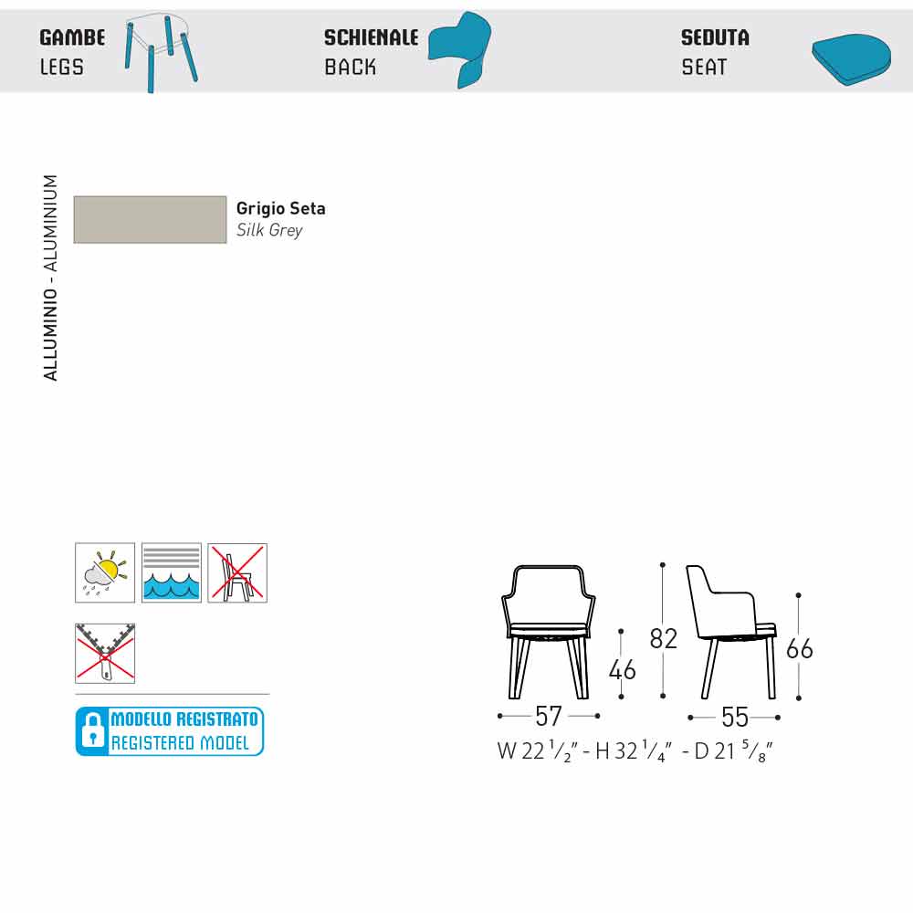 It also comes with aluminum legs painted in silk gray and a seat upholstered in fabric with a polypropylene seat structure.