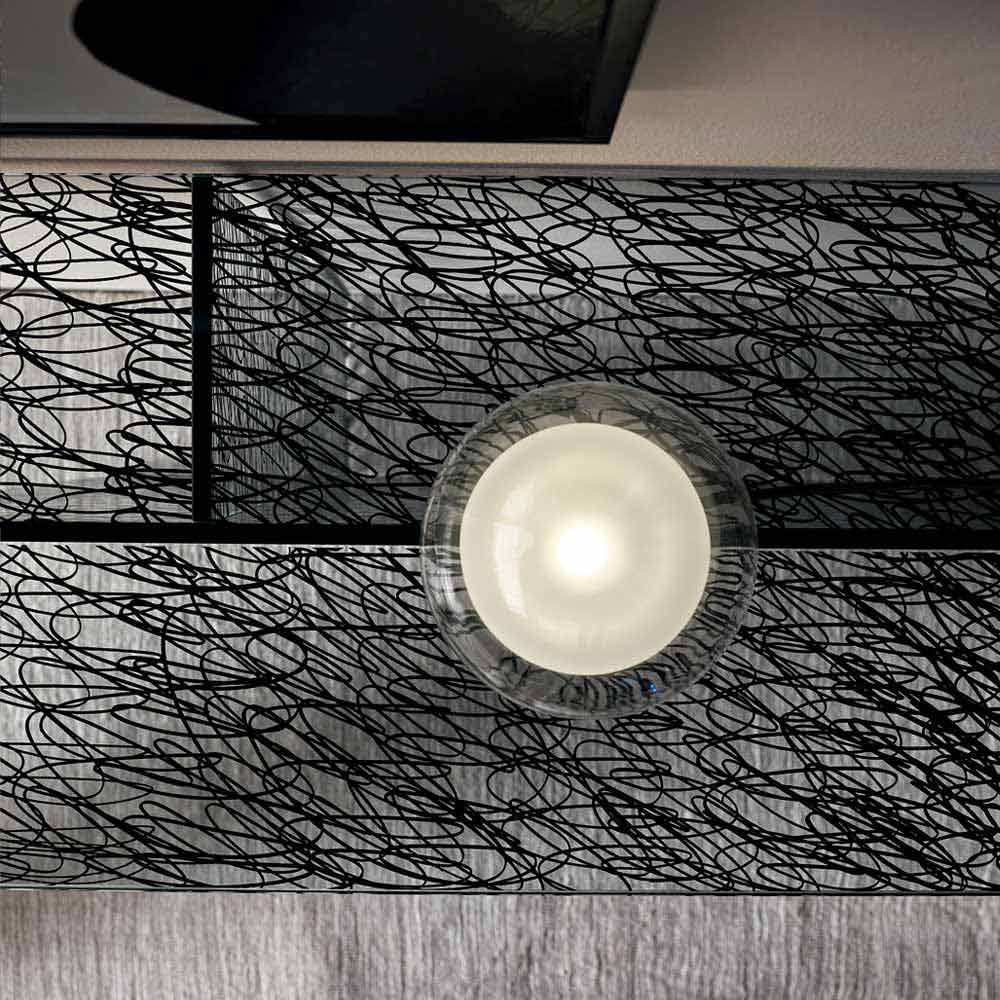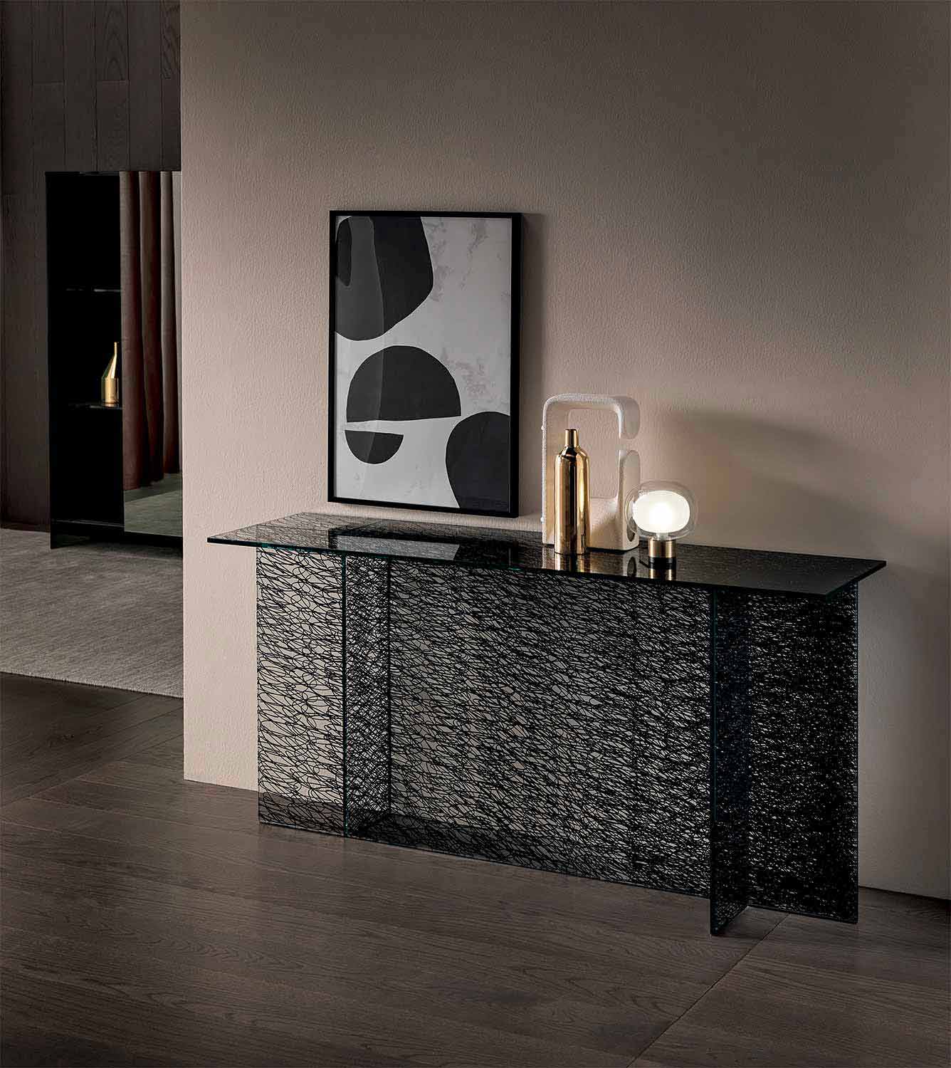 Modern design consolle in extraclear decorated glass, realized by hand in Italy.