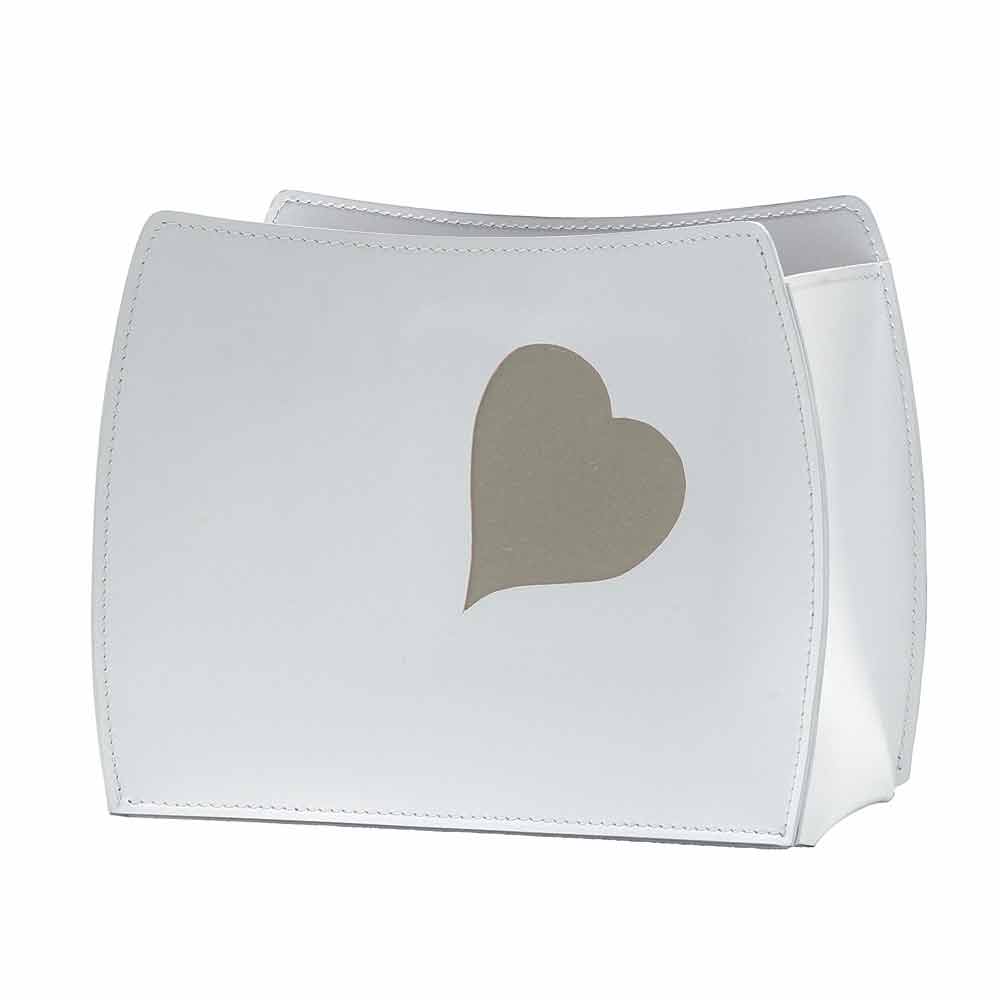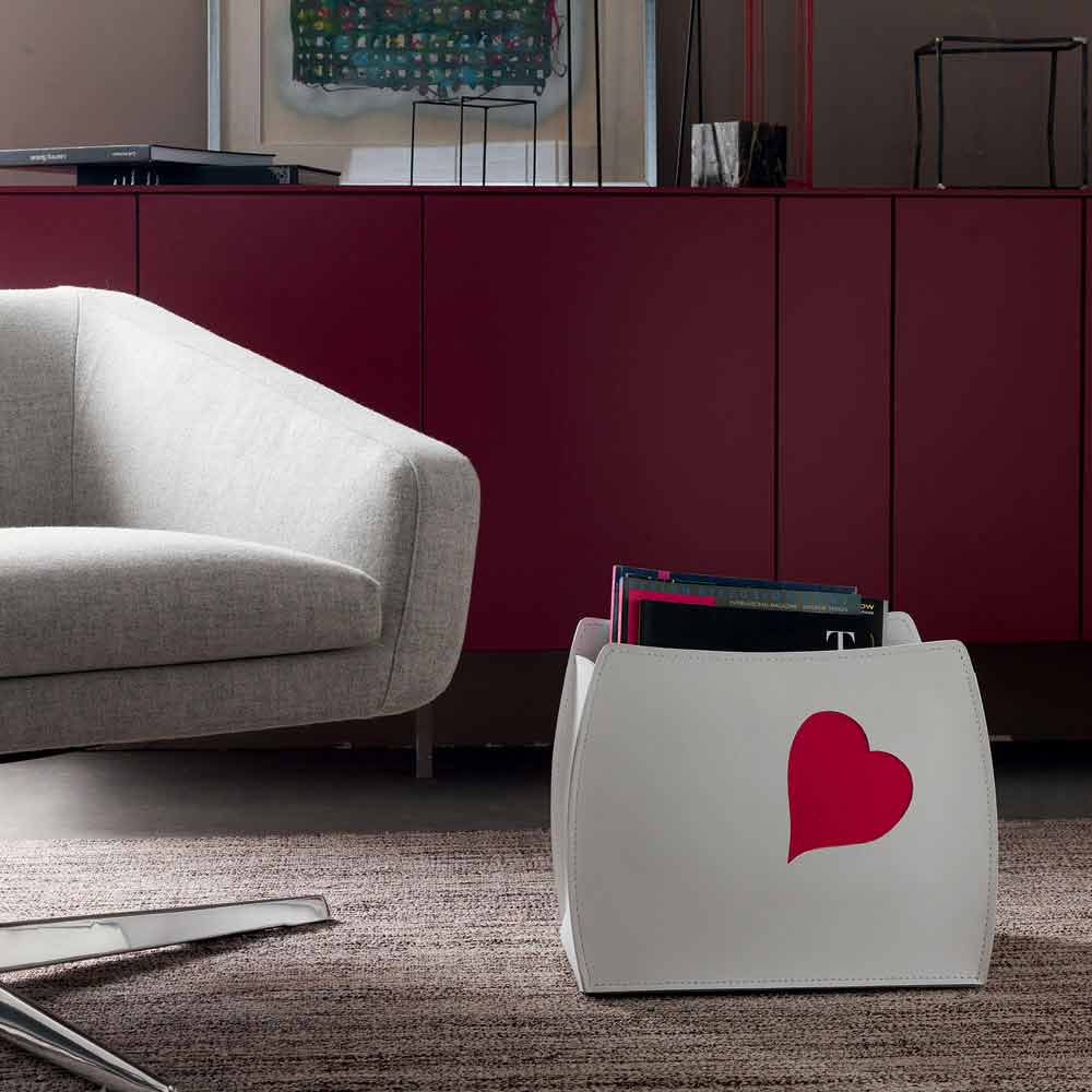 Magazine rack in 100% made in Italy Beatrice leather Decorate your living area or the office with this piece of functional furniture and design Magazine rack in regenerated leather and heart-shaped insert in a choice of red or taupe color. You can select the color of the magazine rack and also that of the heart decoration. The materials used for its production are resistant and of high quality. Production takes place in Italy by skilled master craftsmen specialized in leather processing.