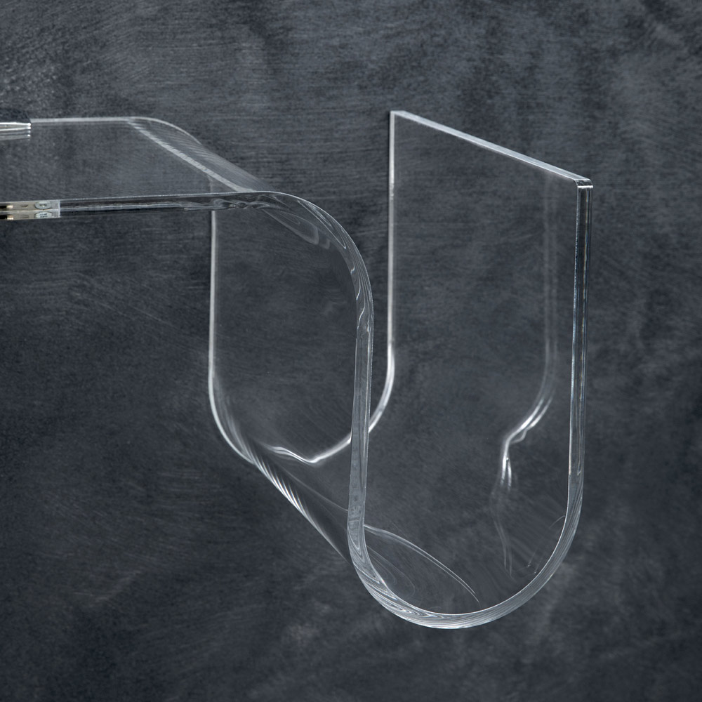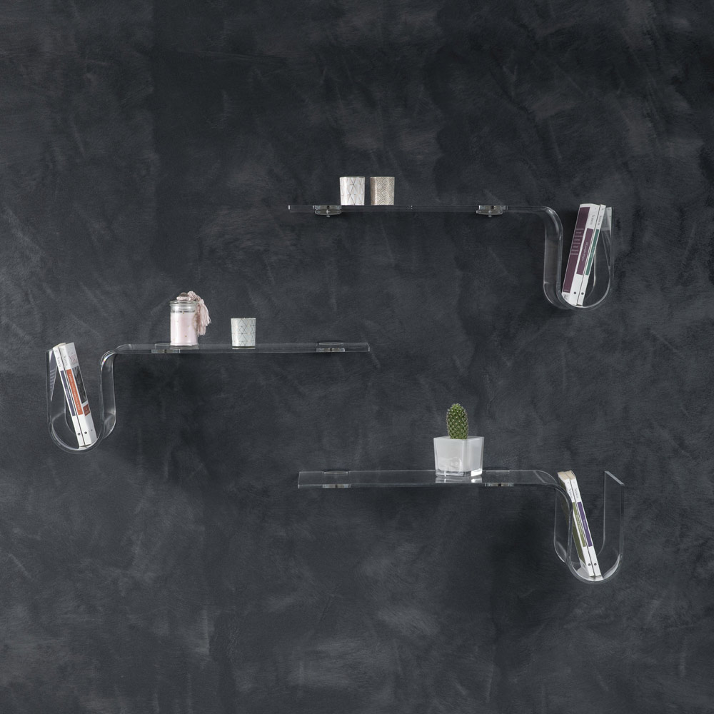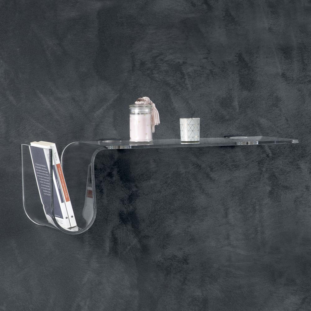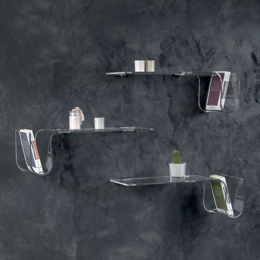 This wall shelf is made entirely of 8 mm thick transparent acrylic crystal , available in the right or left version. It is characterized by the curved side line ideal as a magazine rack. Thanks to the transparency and brilliance of the material, the piece of furniture seems to float suspended in the air.