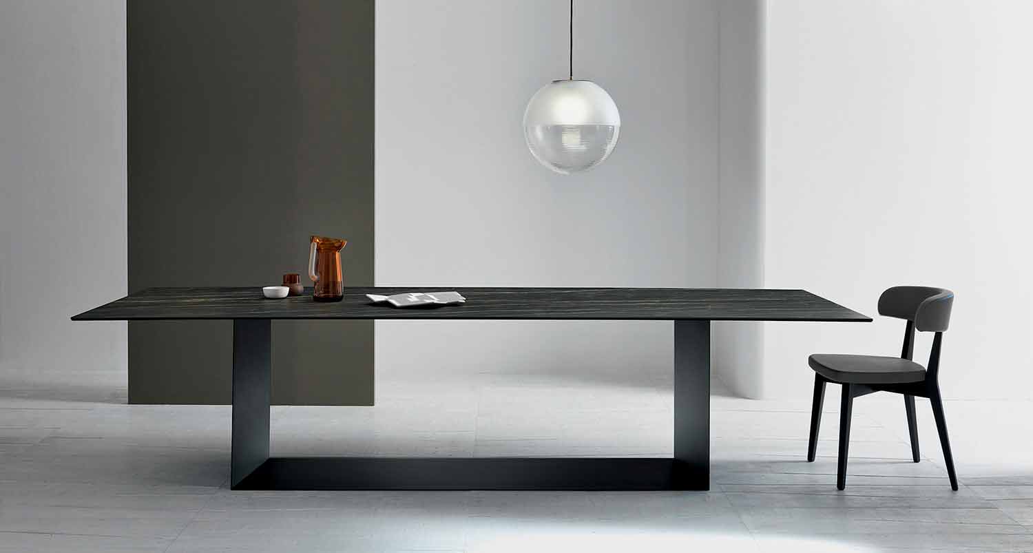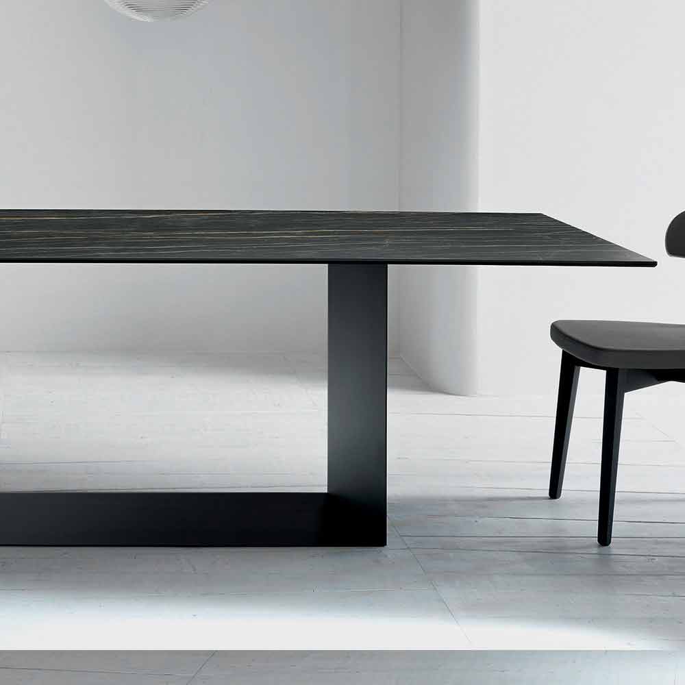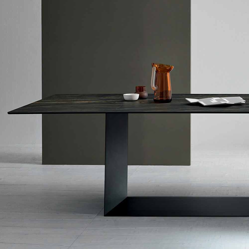 Living design table in matt Noir Desir ceramic and base in matt graphite black or brushed bronze painted metal, made in Italy.