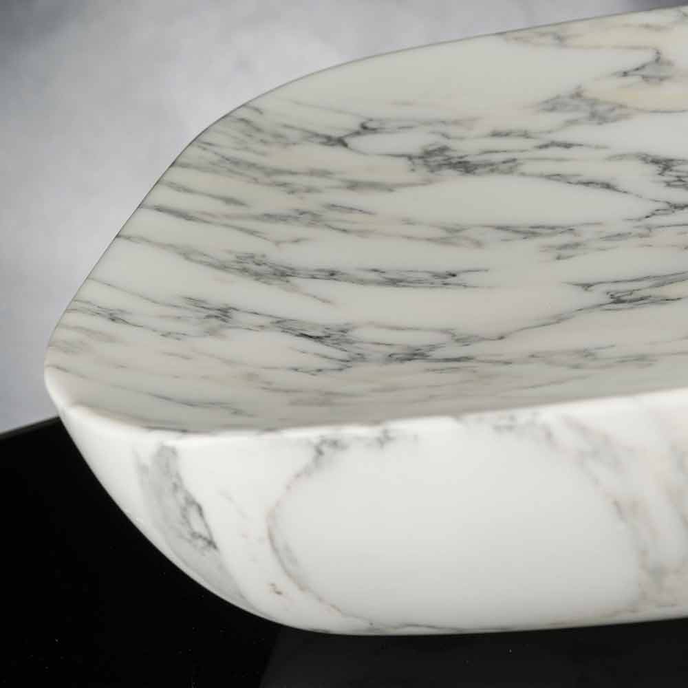Made in Italy decorative trayĀ in white Carrrara marble , a precious variety of marble that is made through the processing of natural stones allows to obtain more complex shapes. An object of intrinsic elegance that arises from the encounter between the study of natural phenomena and the interaction of different materials with the technologies used by man. The result is a sophisticated and versatile pieceof furniture which allows it to be used as a real tray, as a refined centerpiece but also as a pocket emptier if positioned at the entrance or as a simple decorative element in any place in the house, proving capable of giving a extra touch to the furniture thanks to the timeless elegance of marble and its wonderful veins.