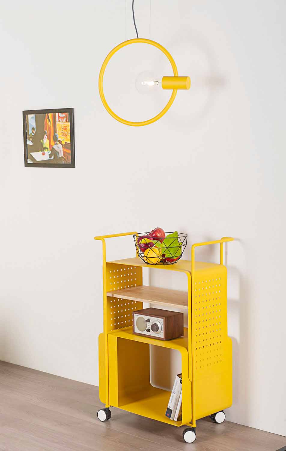 This trolley represents a particularly versatile element as it can be used in various situations and environments such as the kitchen, the living room or even the office. Thanks to its young and modern design, it is ideal for environments with extravagant and unusual furnishings but also for more minimal styles to give color and personality. Entirely made in Italy , its structure is in RAL painted steel and includes 4 practical shelves on which to store the most varied objects, one of which is in ash wood which helps to give a touch of elegance. It also has a set of 4 wheels that allow you to move the trolley easily through the two side handles.