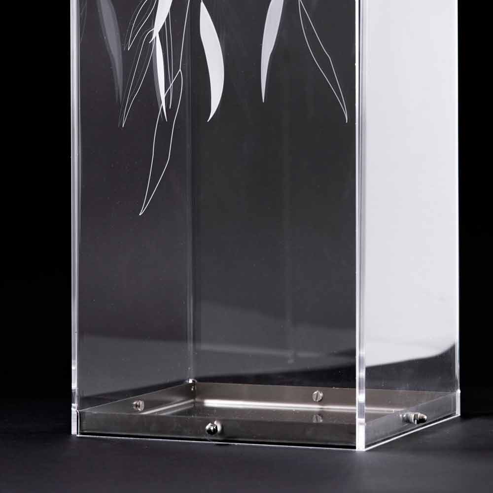 The umbrella stand in transparent plexiglass is characterized by the laser-marked decorations of leaves and base in stainless steel.