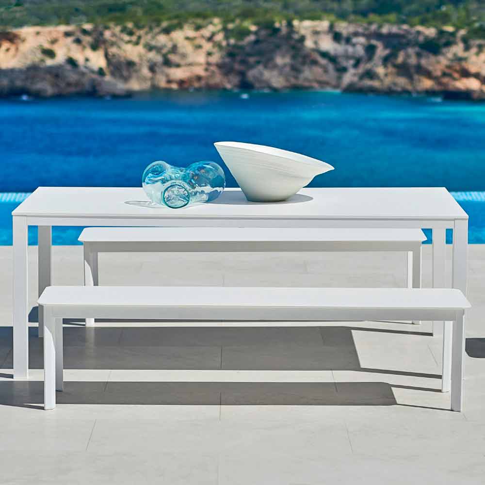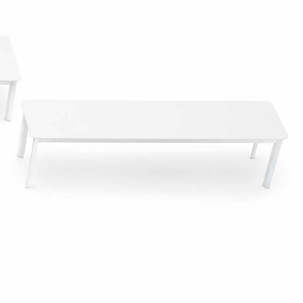 System is a fantastic garden bench with a white powder-coated aluminum structure; with seat top in HPL (sp 1.2) in finish: silk gray black border, white black border, anthracite black border, white white border, cement brown border, bedonia brown border, corten brown border; or with a bush-hammered ceramic top (sp 1.2) in a finish: white lime and gray porphyry; or in teak (sp 1.7) from certified plantation.