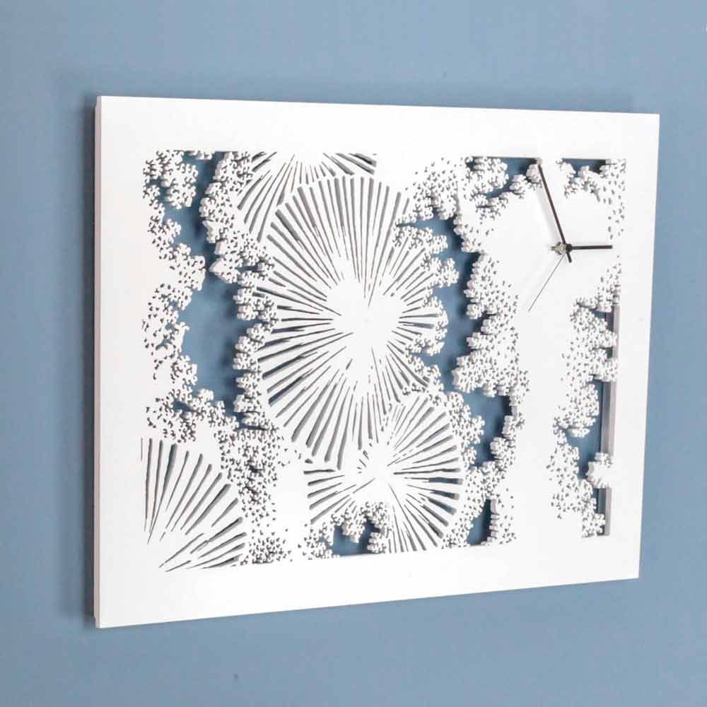 Large wall clock in white or dove gray wood, rectangular and modern design, laser carvings made in Italy.