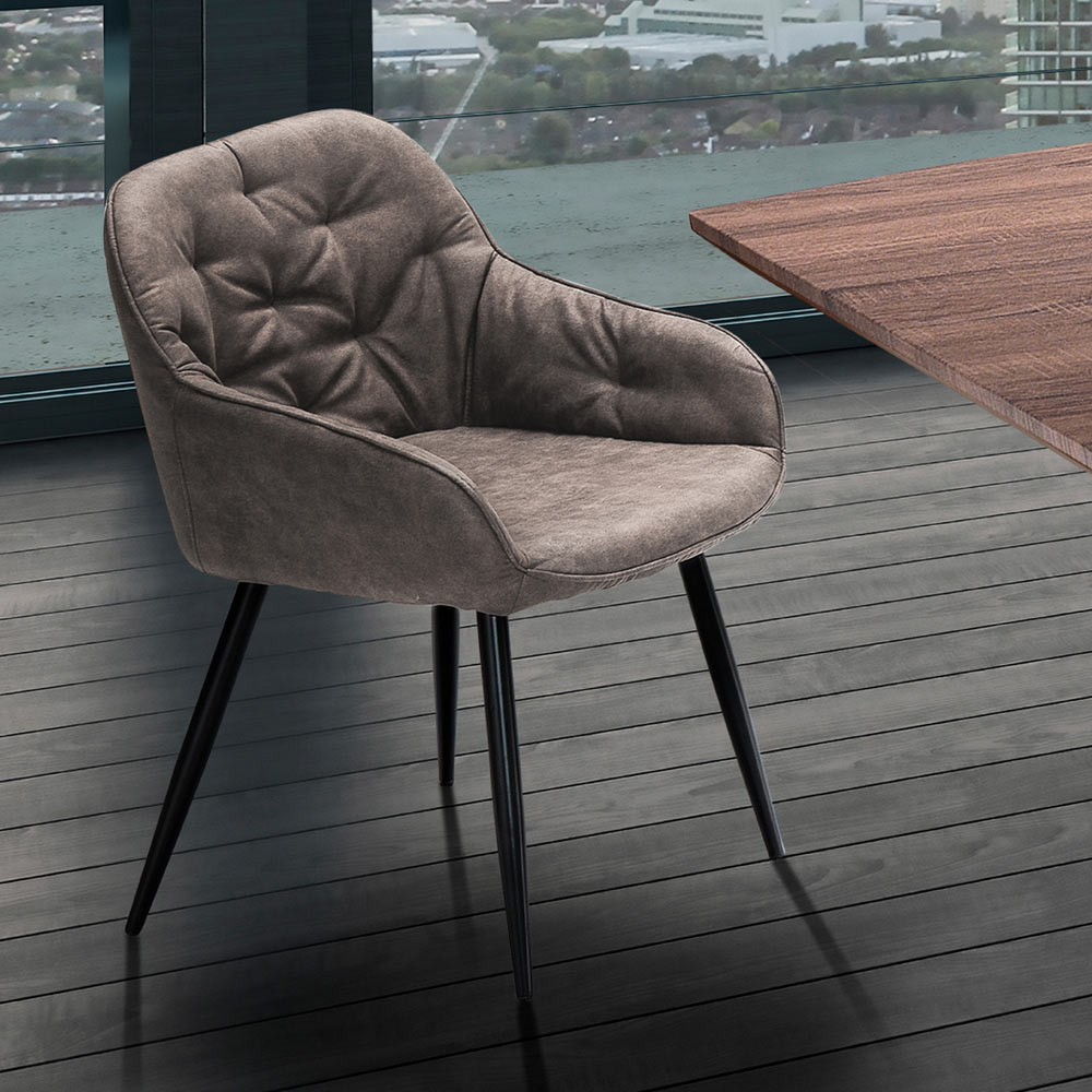 Dining room chair with legs made of matt black painted metal and padded seat covered in aged effect synthetic leather . An elegant and classy furnishing accessory characterized by the particular backrest enriched by stitching that give the final aesthetics of the chair a vintage and refined effect . The result is a welcoming and comfortable seat that contributes at the same time to complete the style of the room through its captivating personality and its refined character .