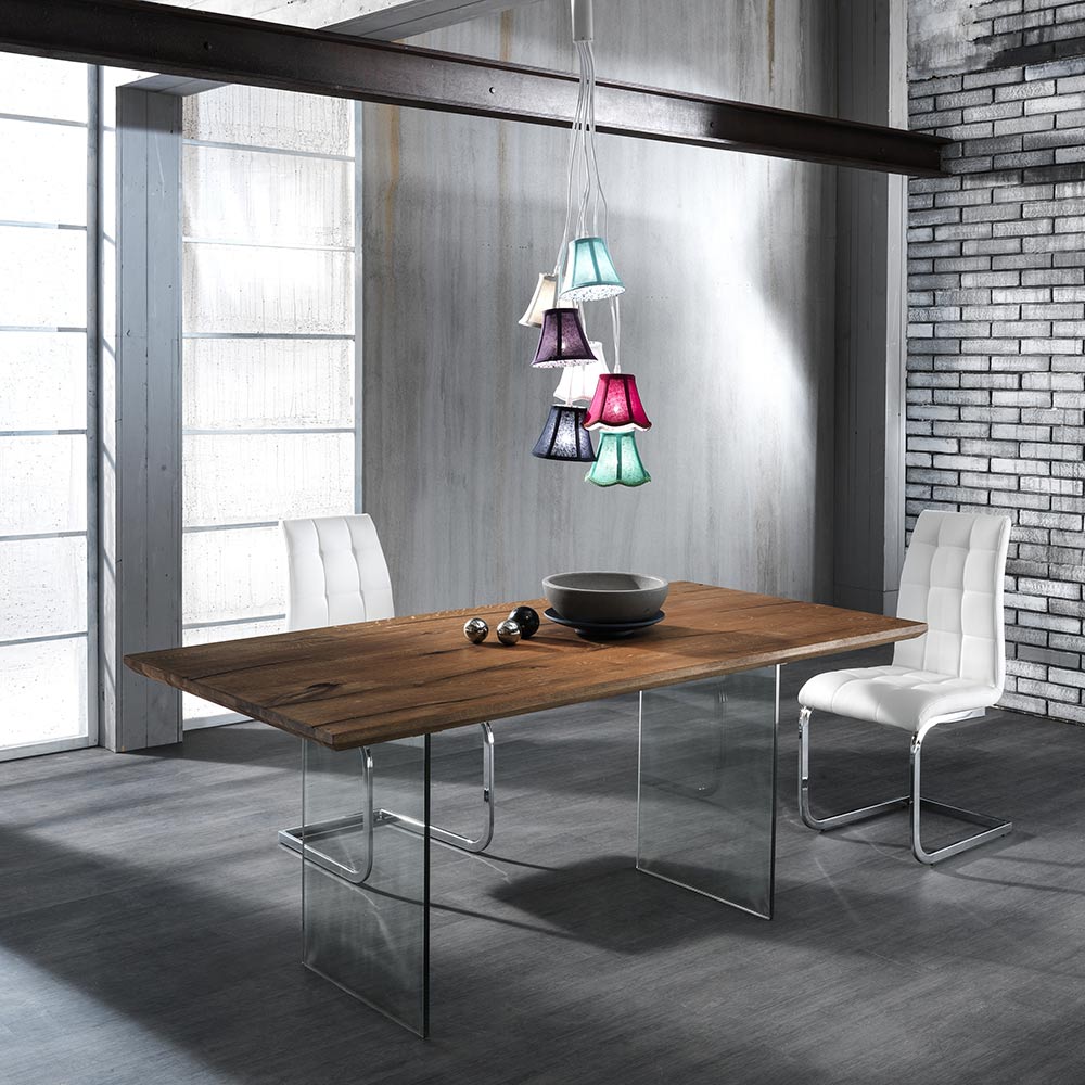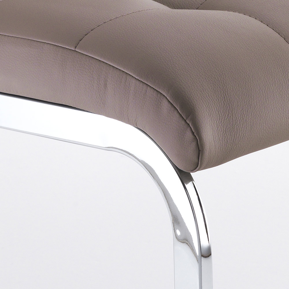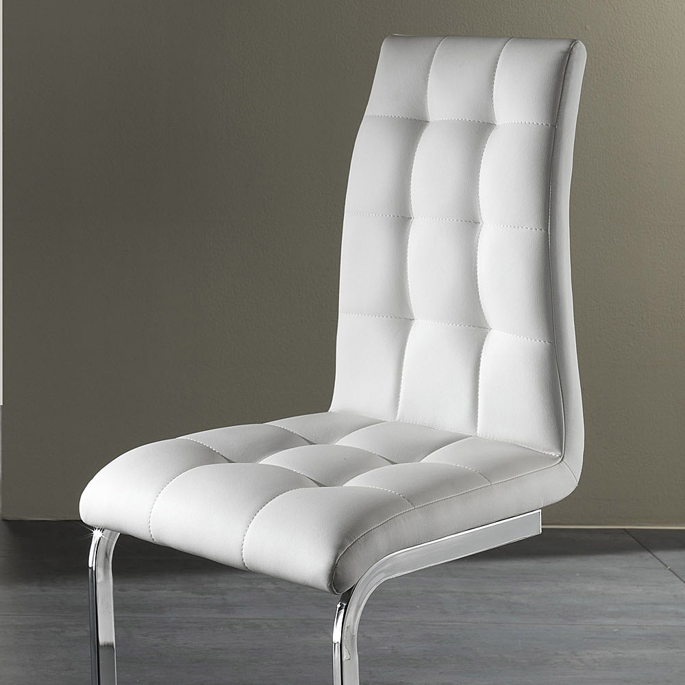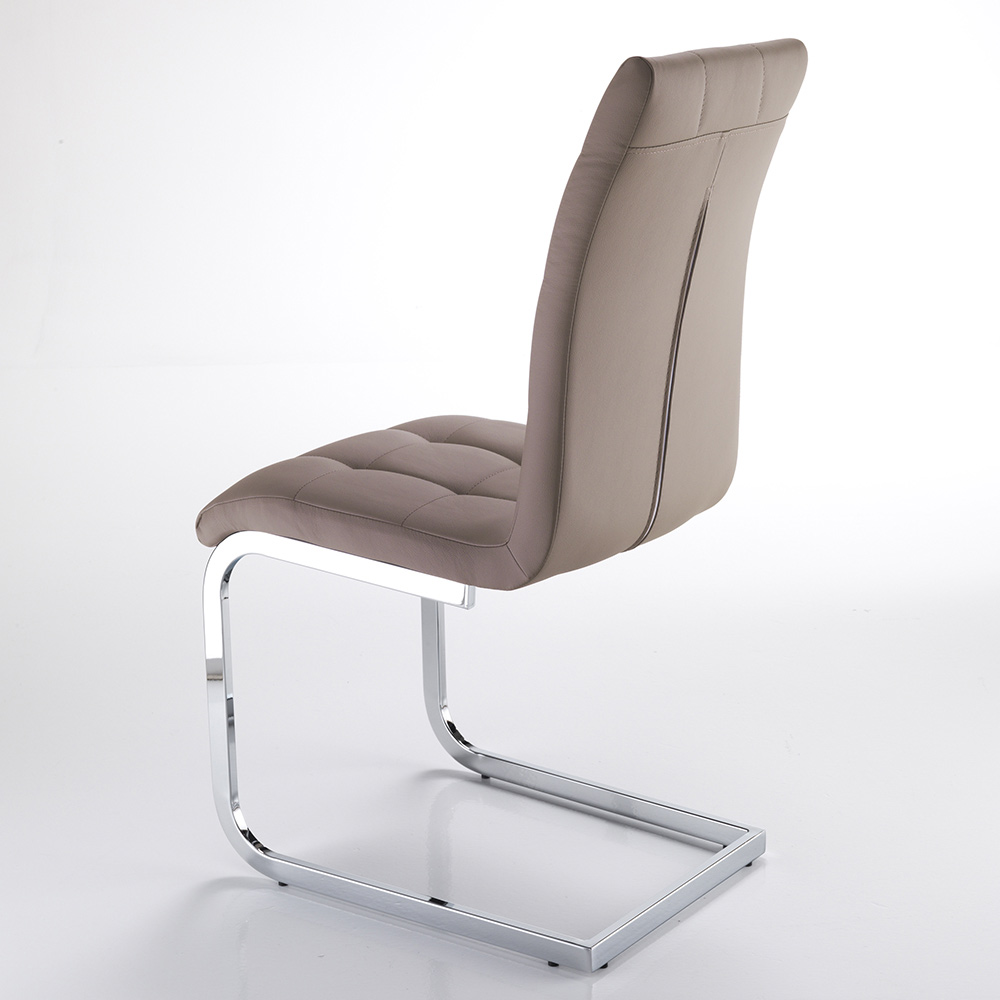 Chair for dining room or kitchen with sled base made of chromed metal and seat covered in synthetic leather . A modern and elegant design capable of giving an exclusive touch to any domestic or contract space through a strong refined personality . Its aesthetic helps to create an exciting and scenographic atmosphere and allows you to create strongly characterized places that can enhance the expression of your personality.