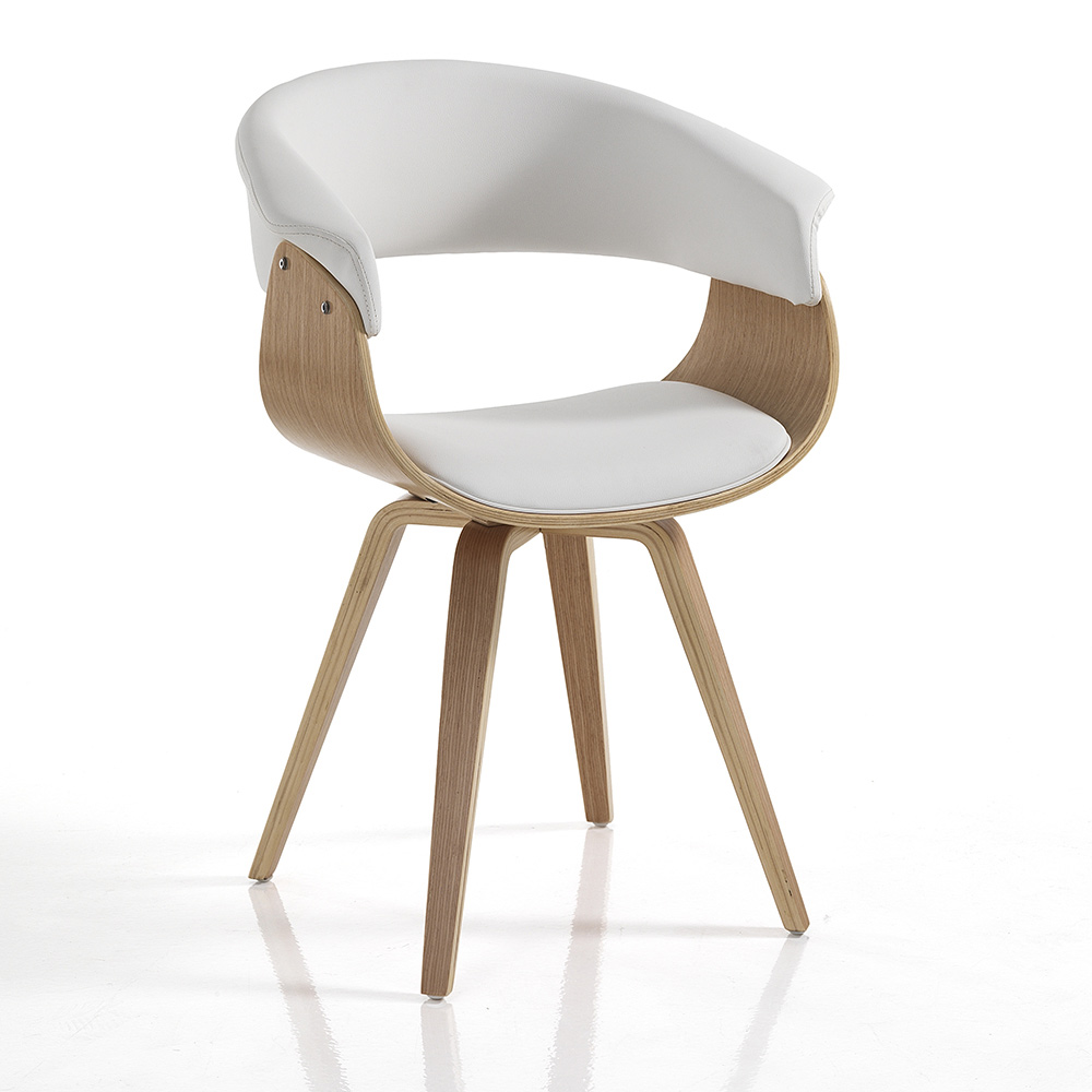 Dining room chair with structure made of plywood and inserts in synthetic leather . A unique and captivating style characterizes this seat whose aesthetics are marked by soft shapes and rounded lines that ensure a comfortable and enveloping product, therefore ideal for completing in a functional way dining rooms or kitchens with modern furnishings. The wonderful combination of the imposing touch of wood and the timeless elegance of leather gives life to an original , avant-garde chair with a strong contemporary personality .