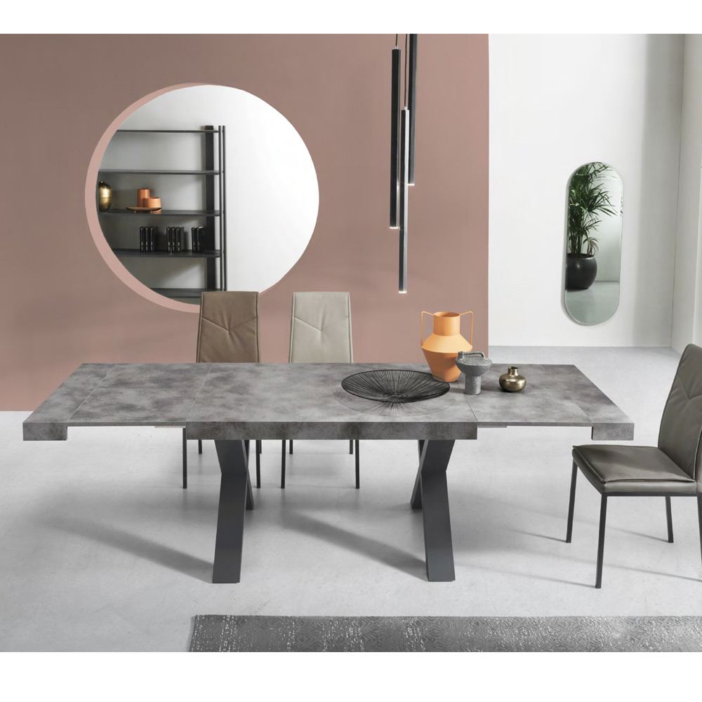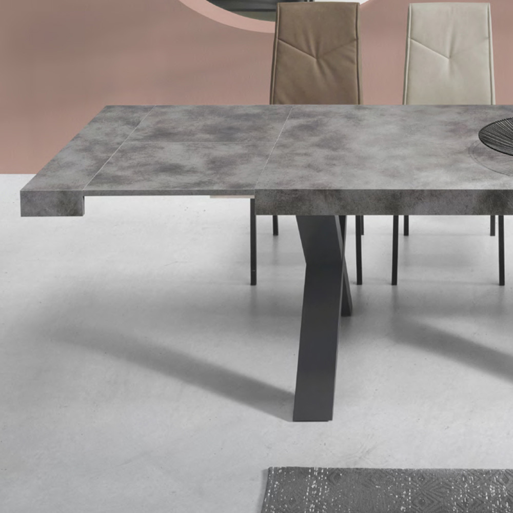 Dining table with top and extensions in cement effect laminate and structure in anthracite finish. A piece of furniture entirely made in Italy designed to satisfy the requests of those looking for quality , elegance and functionality within a single product. What is striking about its aesthetics is the particular crossed conformation of the base which offers solidity and robustness to the product as well as giving a touch of exclusive personality to its final design. The elegant concrete-effect top instead gives the table an imposing style capable of conquering the leading role in the room thanks to its large size.
