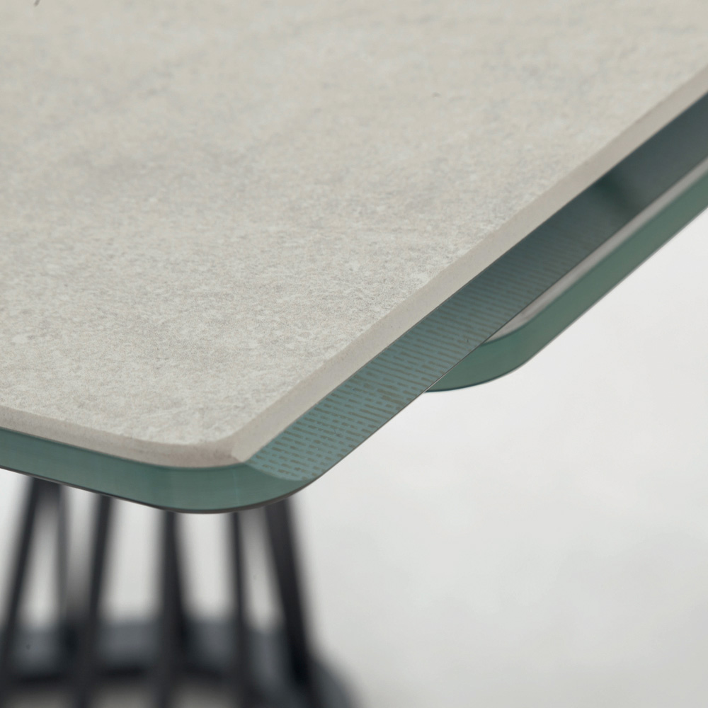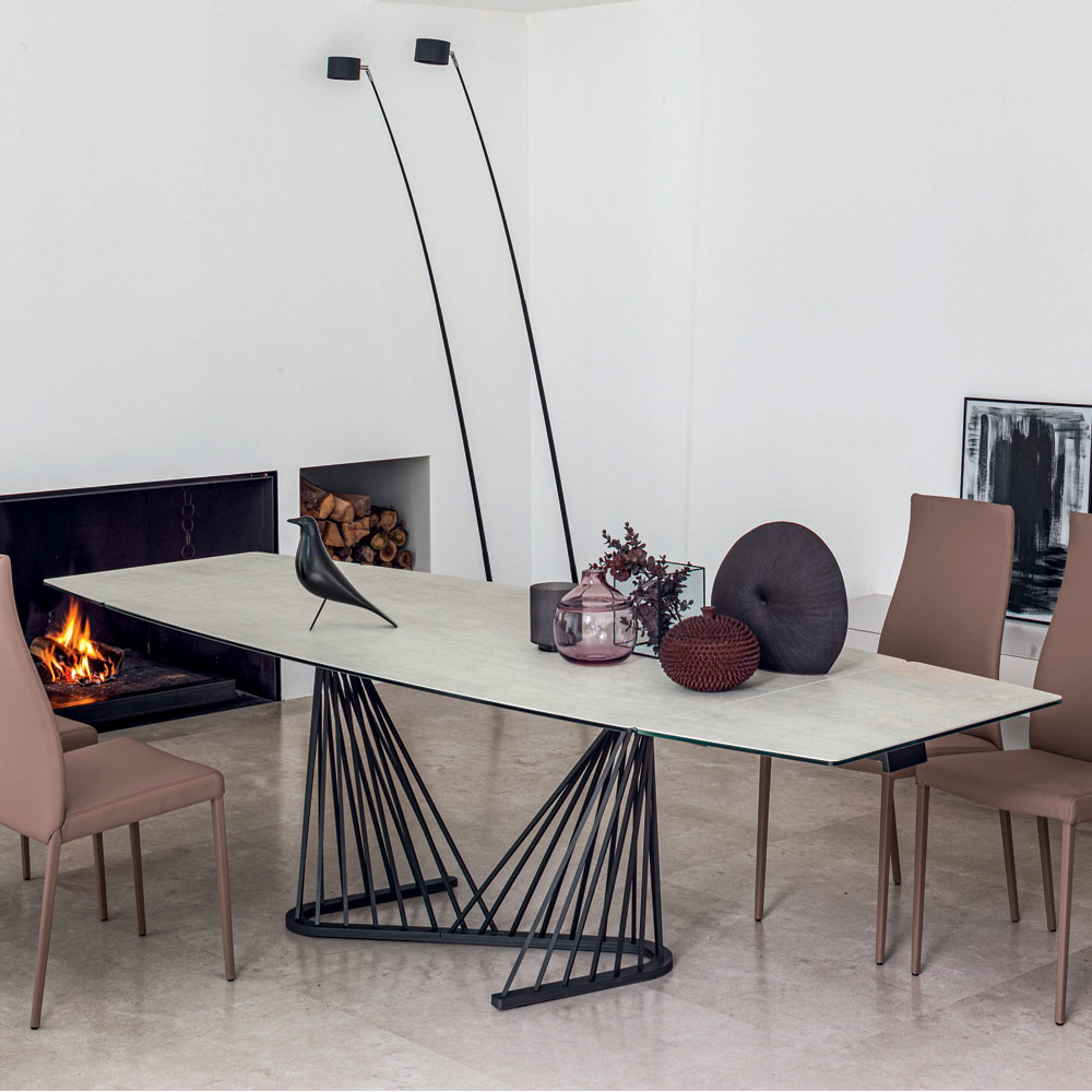 This extendable dining table has a structure with a square metal rod base powder coated in embossed graphite and a barrel-shaped top in opaque ceramic on glass with extensions placed under the top and extendable aluminum frame. Its peculiarity is given by the structure made up of a series of metal cords of unequal length and stretched to support the glass top. Its design with sinuous and elegant lines gives musicality and elegance to the environment.