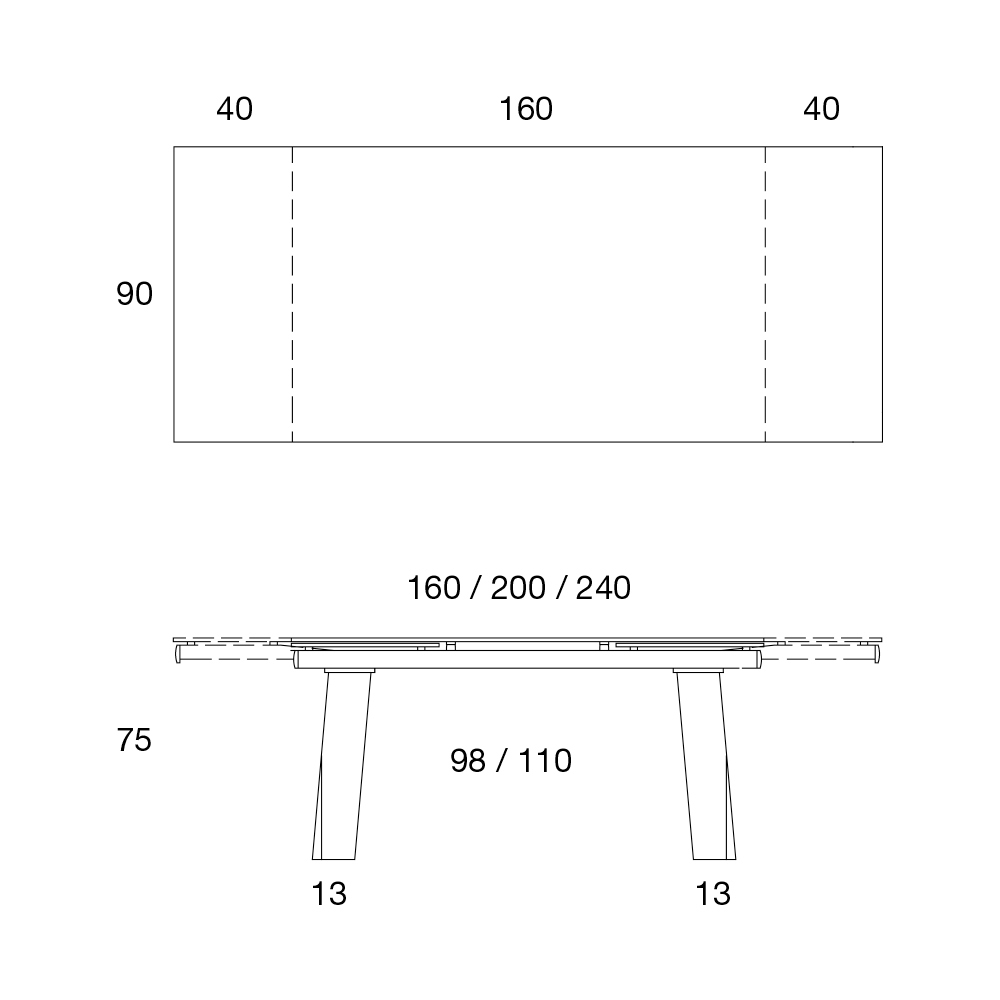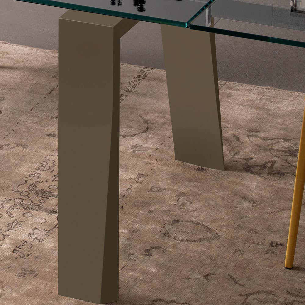 This extendable dining table has a structure with legs in metallic bronze lacquered wood with a trapezoidal design and a top in extra-clear transparent tempered glass with two extensions and an extendable aluminum frame.