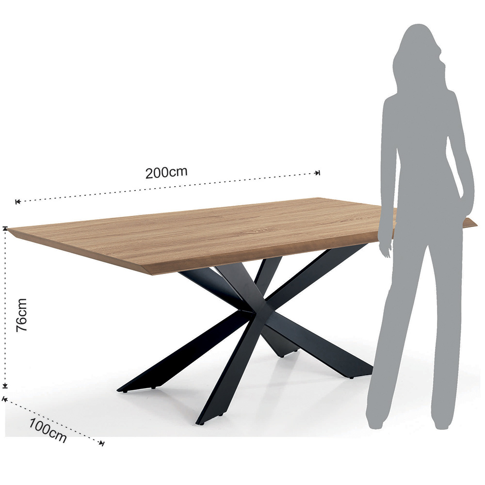 Dining table with top made of veneered mdf with oak finish and base in matt black painted metal . A product with a linear design enriched by the particular shape of the base which represents the glass strong point of the table. The wonderful finishes chosen complete the final look giving a touch of elegance and a sense of innovation while ensuring a solid, resistant and good quality complement . The result is a contemporary style dining table ideal for those who love to furnish their domestic spaces with personality and character .