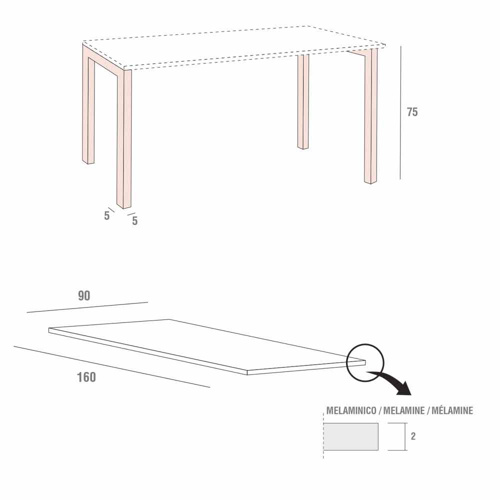 melamine top equipped with ABS edges glued on reactive polyurethane and legs in