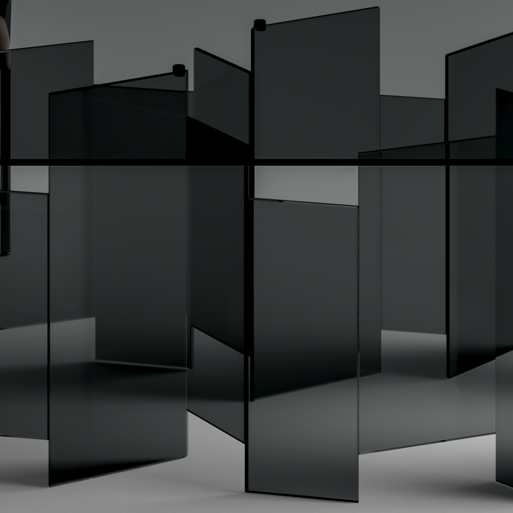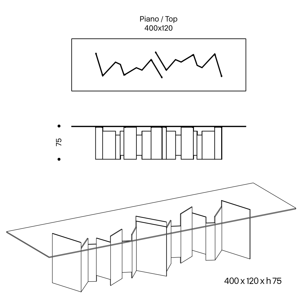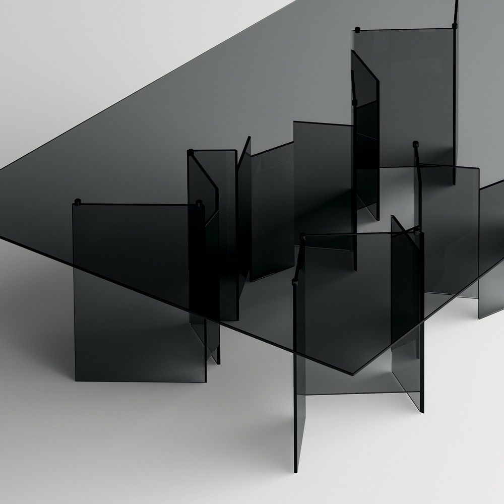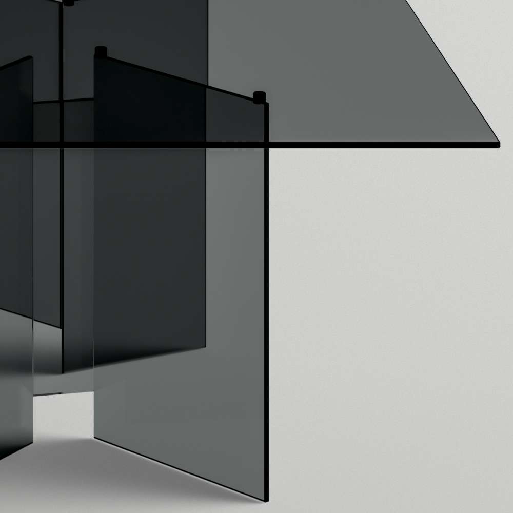 The choice to use a simple material such as glass but at the same time with a strong visual impact characterizes the entire aesthetics of the product making it original , contemporary and elegant , ideal for those looking for a furnishing solution capable of completing the living area of the house with modern and imposing personality . Visually what is striking is undoubtedly the particular shape of the base which is made up of numerous glass plates joined asymmetrically to give the table a sense of dynamism together with an exclusive and refined touch .