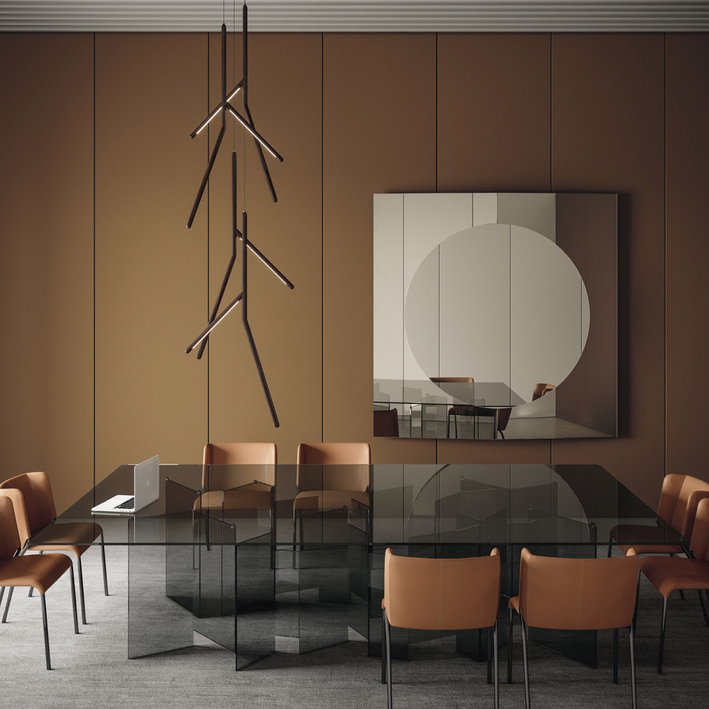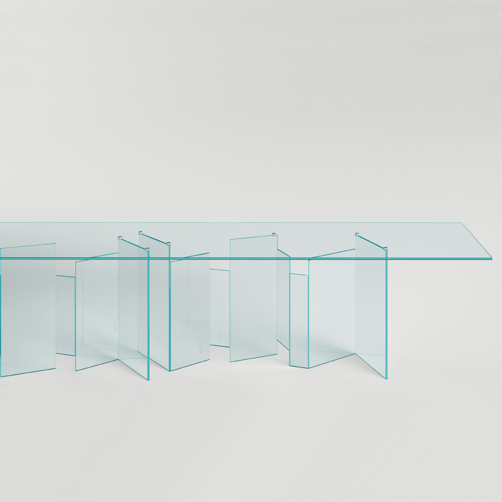 Dining table composed of a base with geometric shapes and a rectangular top both made of glass . A furnishing solution that comes from a Made in Italy production process through the expert processing of glass by skilled craftsmen who allow to give life to the perfect combination of quality , design and functionality .