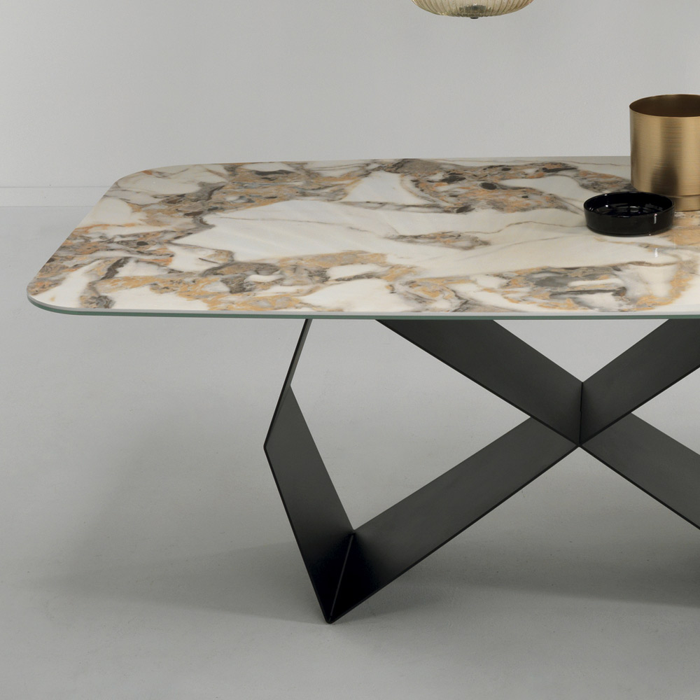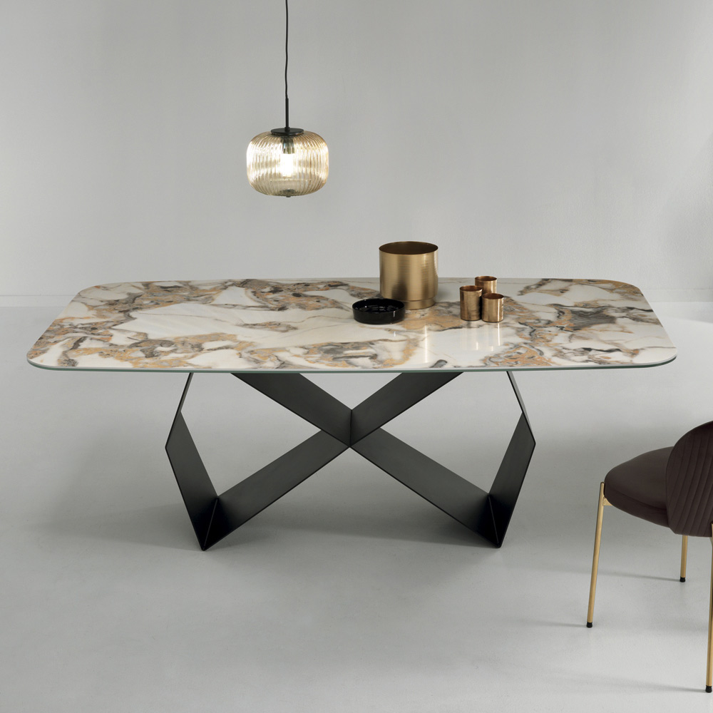 Dining table in marble-effect ceramic and black metal Made in Italy.