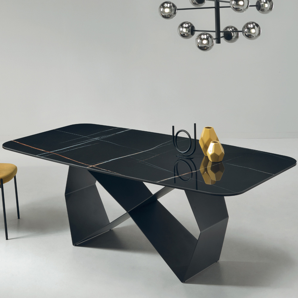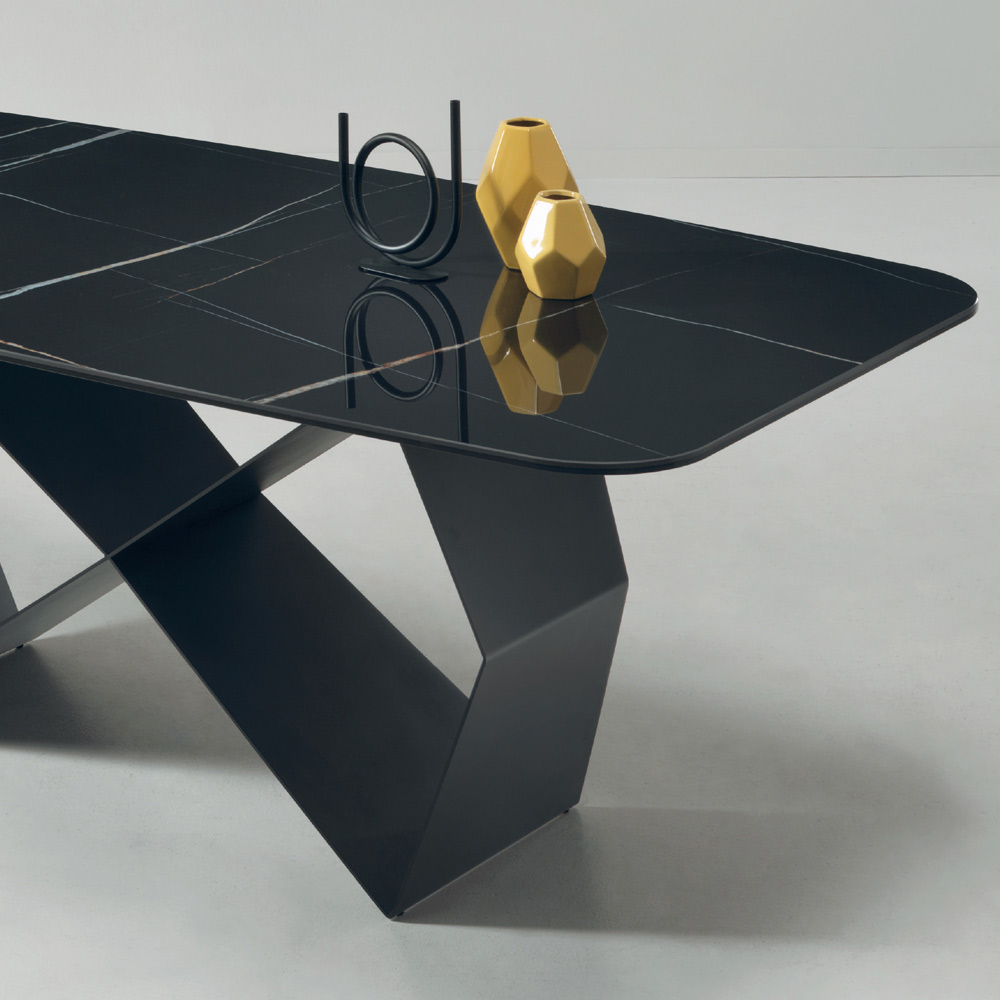 Dining table entirely made in Italy with marble effect ceramic top and black painted metal structure . A piece of furniture with a contemporary taste characterized by simple geometric shapes that come together to create a unique harmony within dining rooms or modern kitchens. The peculiarity of this table is undoubtedly the original conformation of the structure which creates a unique visual effect capable of conquering the surrounding environment with personality, becoming its true protagonist. The elegant marble-effect ceramic top enriches its aesthetics even more for a refined result with a creative and captivating character .