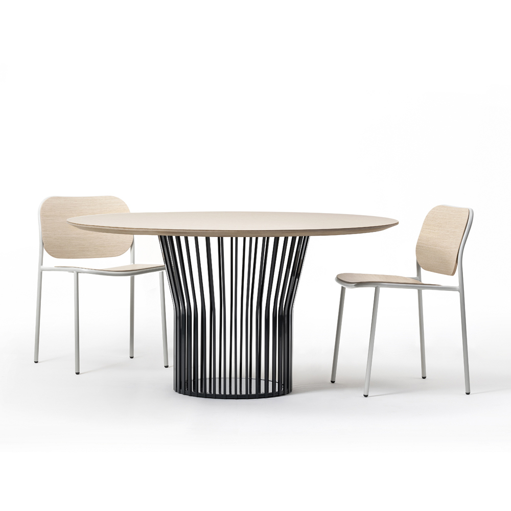 original and dynamic design composed of many spokes of different widths that fold outwards at the top and then open to support the top. The result is an