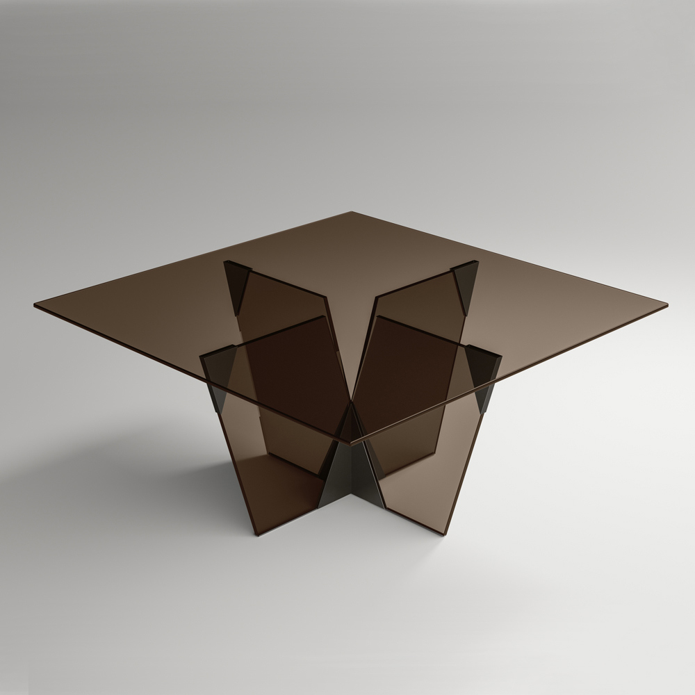 Modern kitchen table entirely made in Italy with square top and glass base enriched with metal details. A piece of furniture characterized by an elegant and sculptural structure that comes from the combination of materials of different nature together with the passion for glass processing, thus managing to define a representation of strength and character through different shapes and thicknesses. The strong point of its aesthetics is the architectural base characterized by a pyramidal joint made of metal which constitutes the essential part of the product. The metal elements complete the design of the table giving shape to the glass of the base and enriching it with personality and originality.
