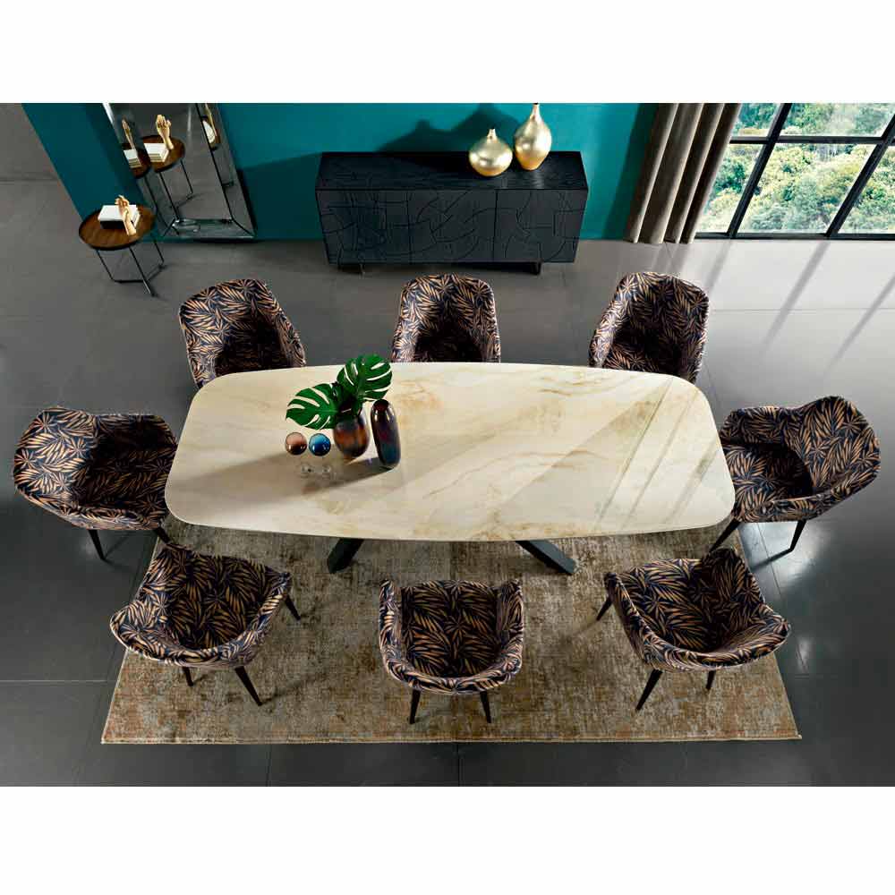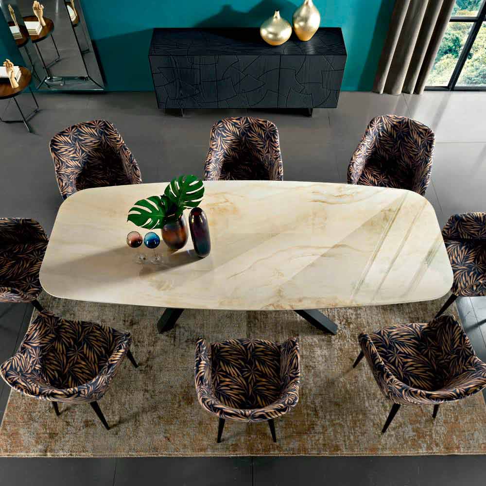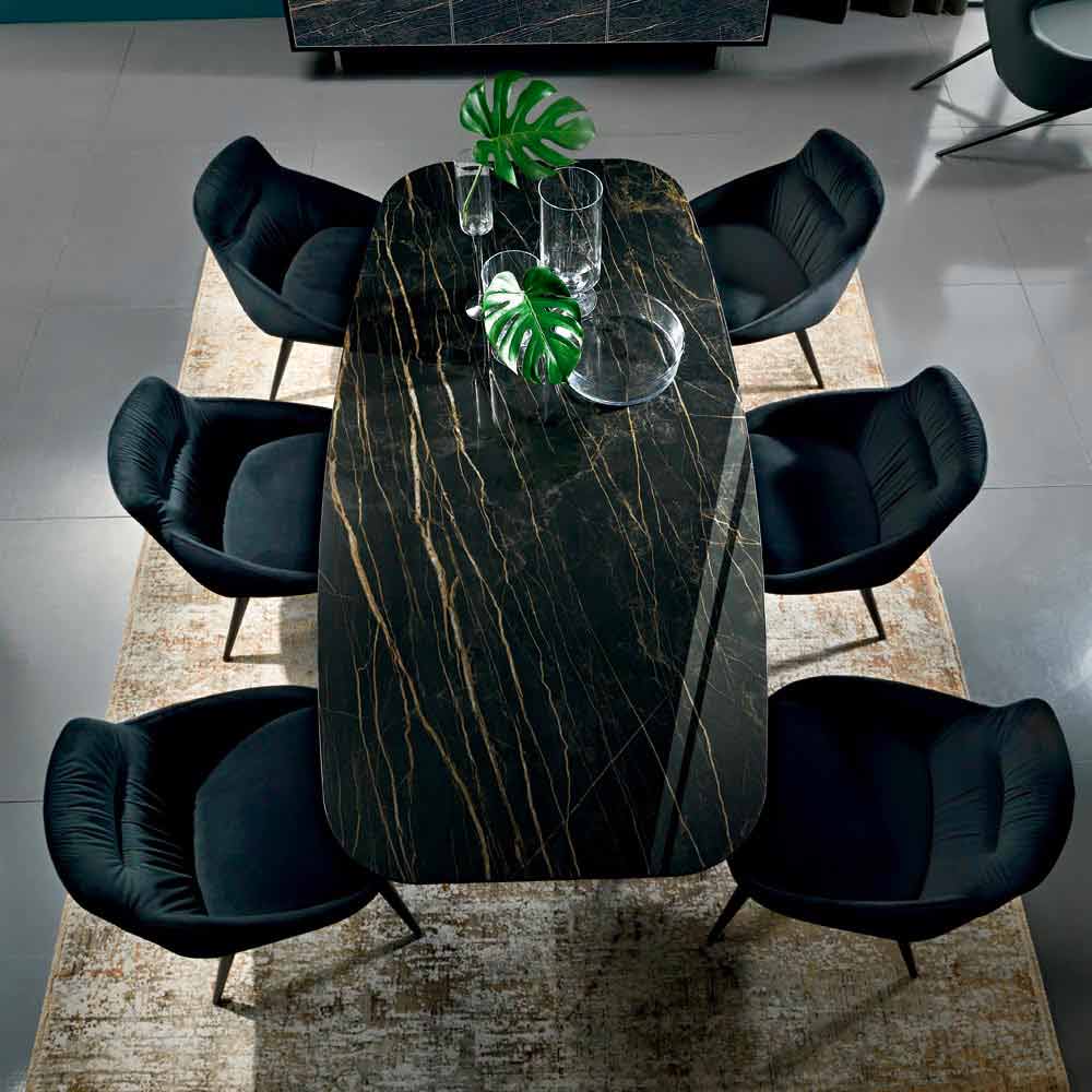 Modern and elegant dining table handcrafted in Italy with barrel top in hypermarble laminam (thickness 10 + 6 mm) obtained from a plate of beveled glass and a ceramic plate and black painted steel base. Thanks to its captivating and refined aesthetics , this wonderful furnishing accessory transmits an exclusive touch to any environment thanks to the particular attention to detail and the use of high quality 100% Made in Italy raw materials . In fact, in addition to completing the look of the table with elegance, the laminam hyper-marble is a material that has numerous peculiarities which make it an ideal choice to provide at the same time a solid table top and a classy design capable of revolutionizing every environments with personality.